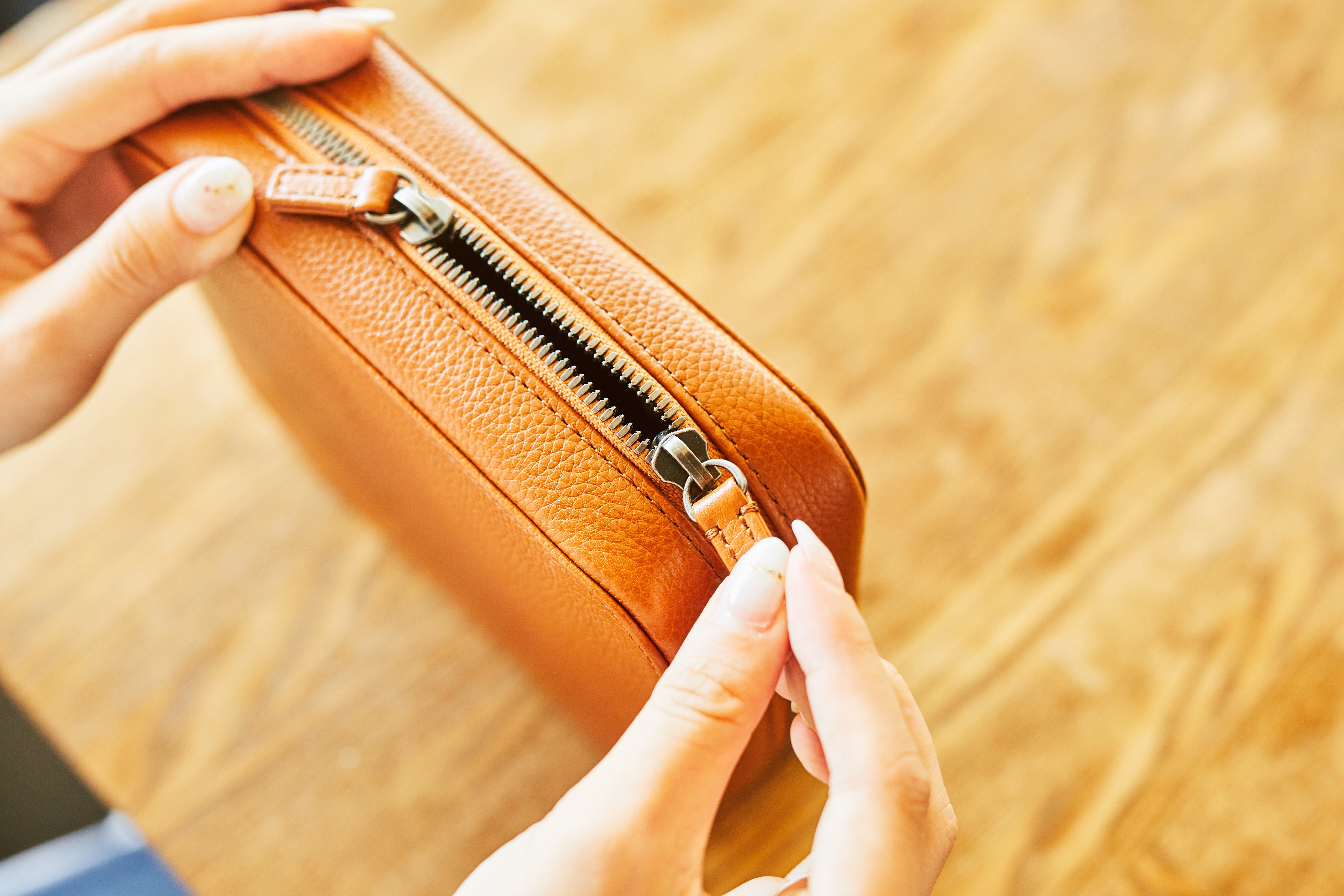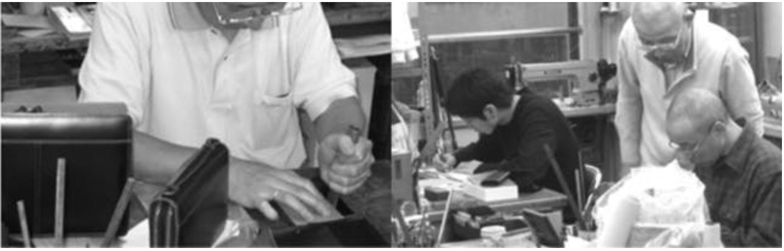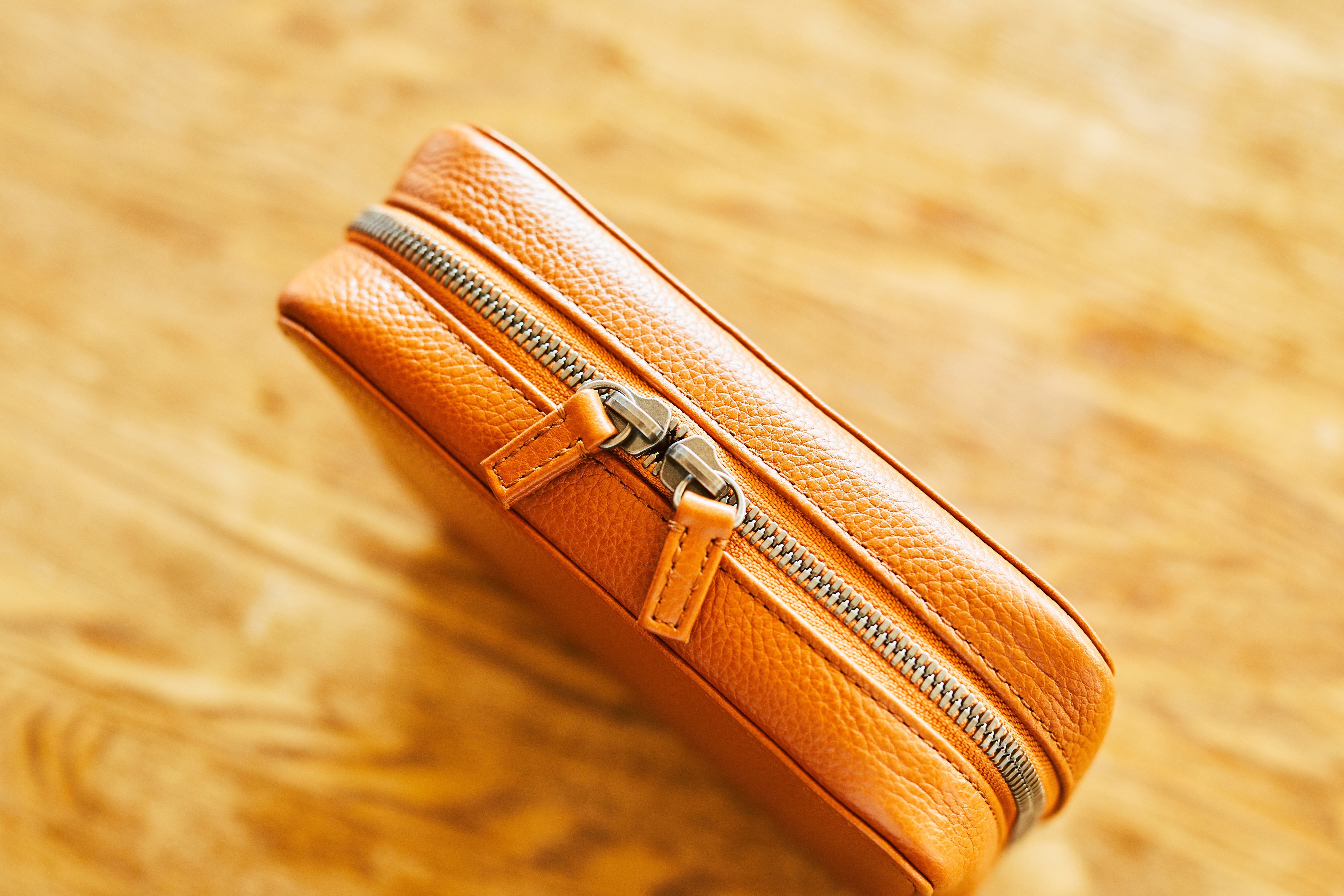 普通のレザーポーチよりも構造が複雑で手間がかかるため、数十社に問い合わせしても、受けていただける職人の方が見つかりませんでした。根気よく問い合わせを続け、唯一話を聞いていただき、面白がってくれたのが東京で80年以上革小物を制作している革小物制作会社の方々です。