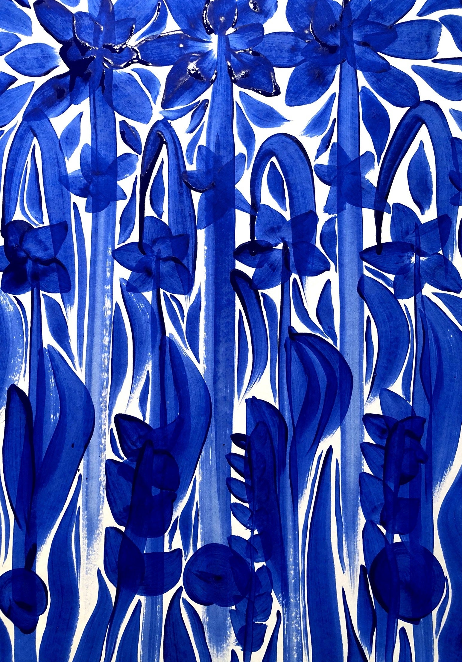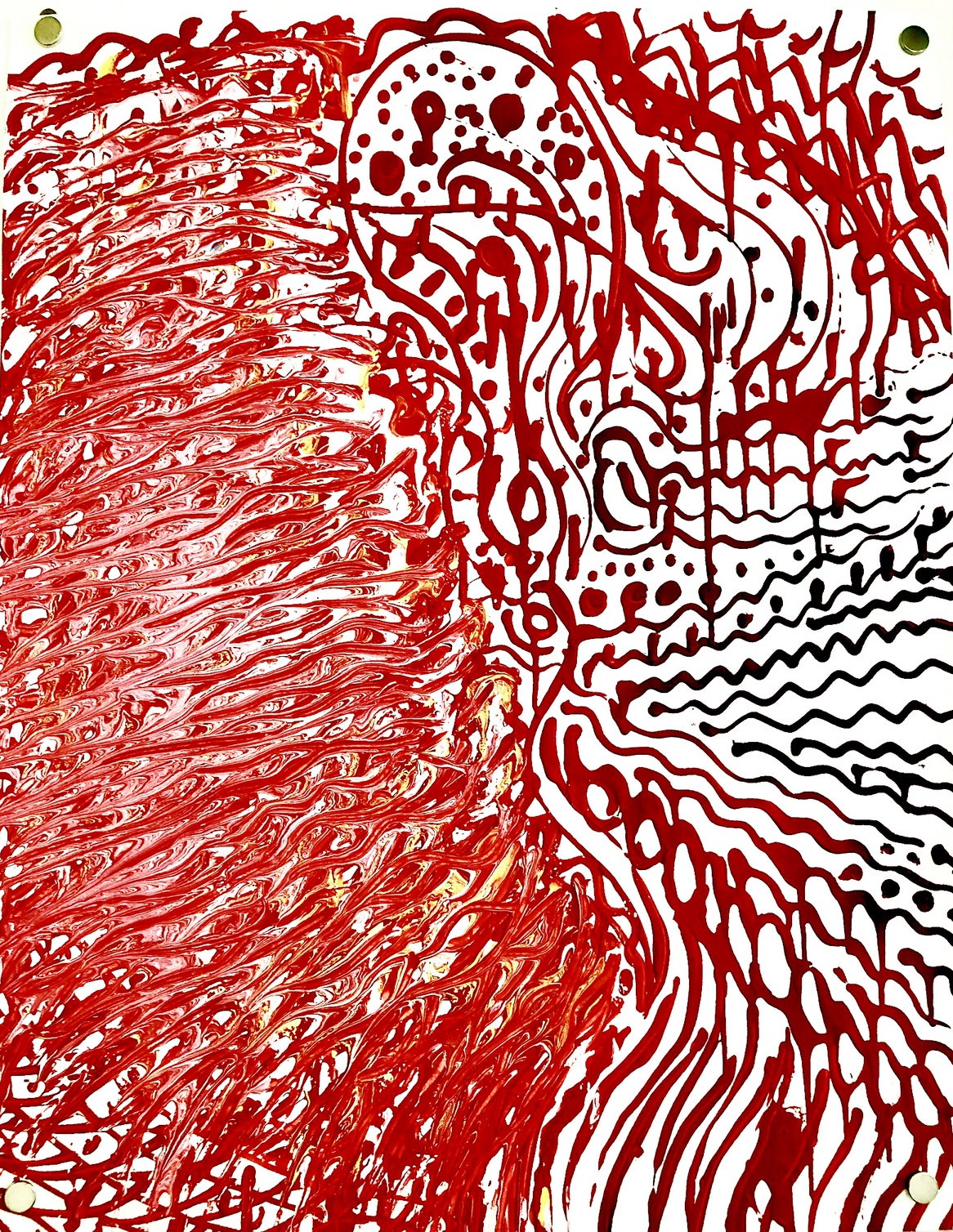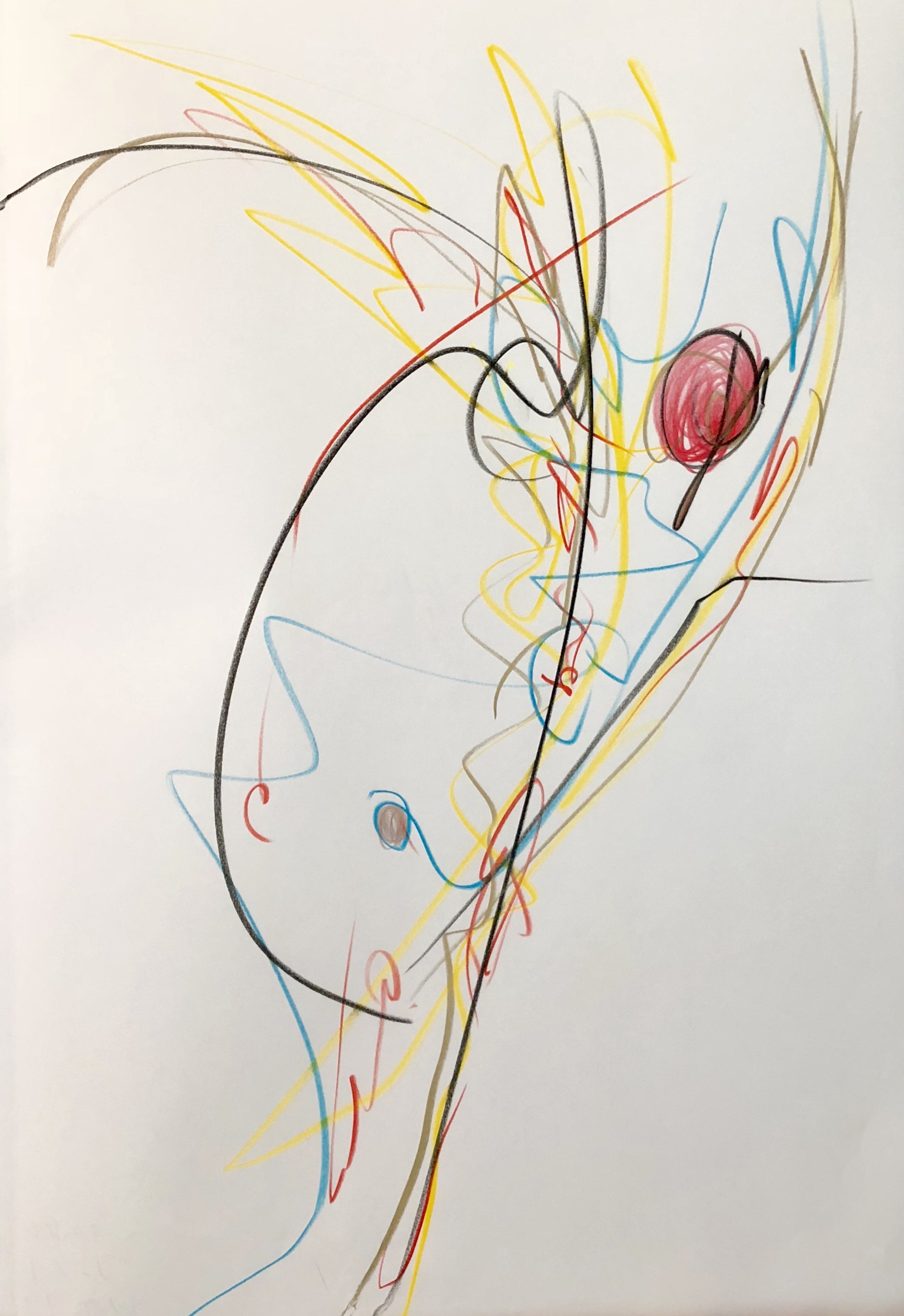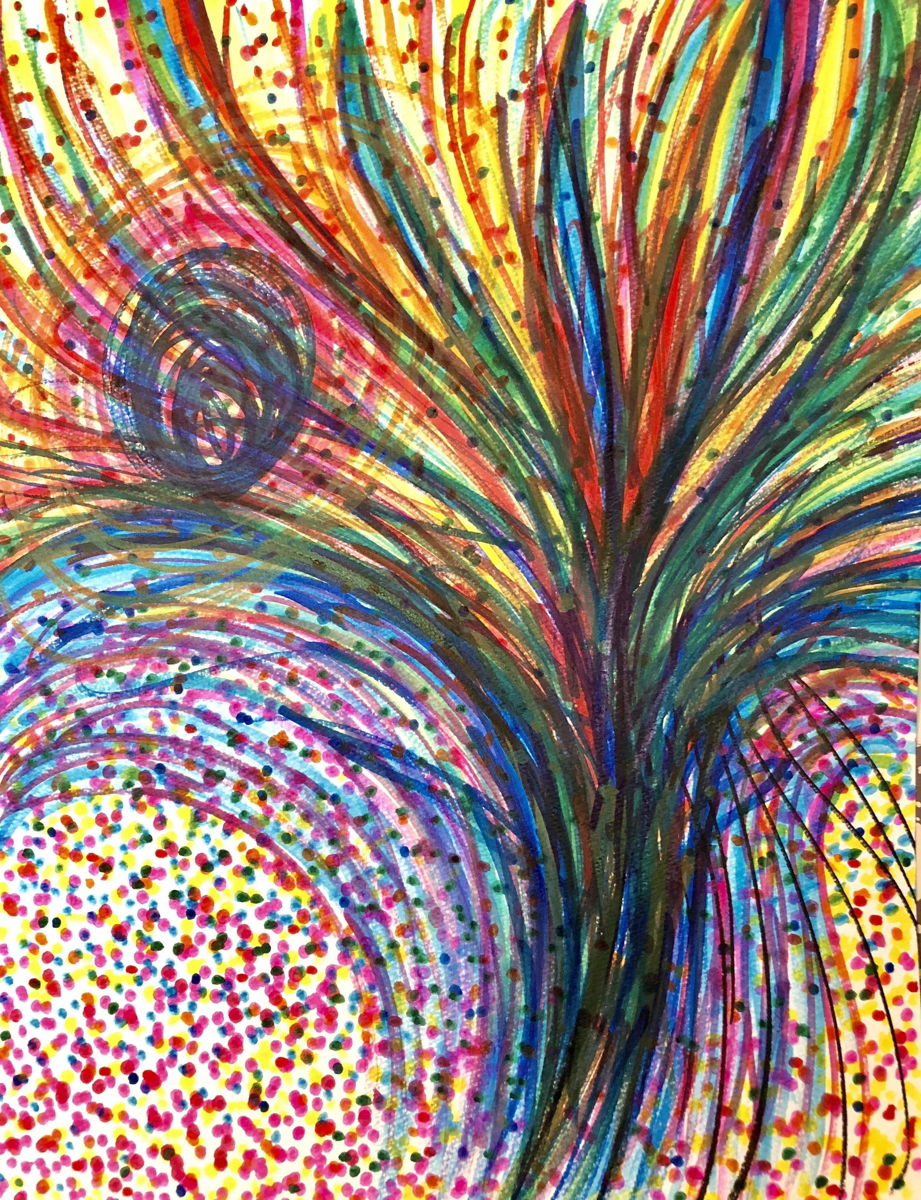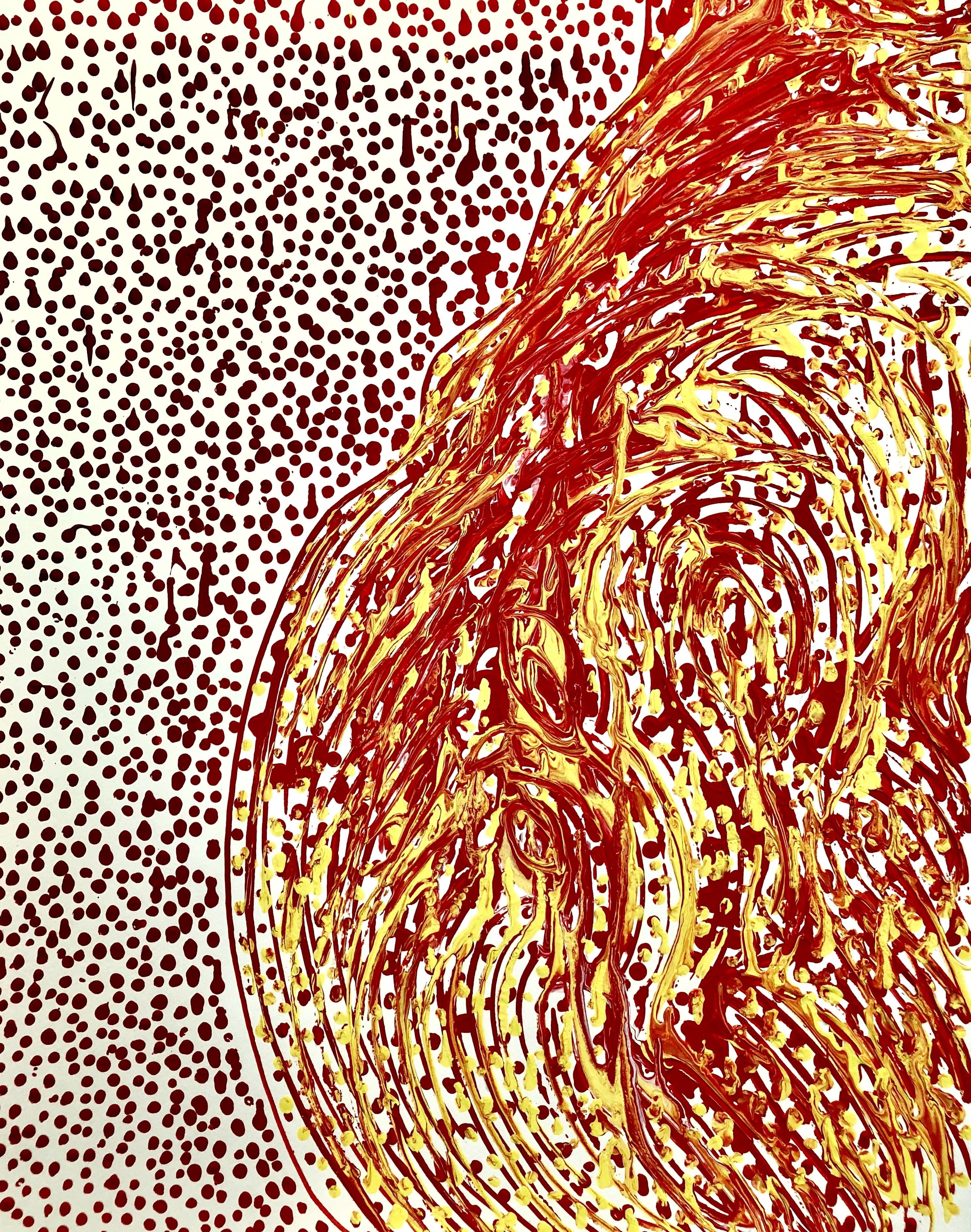 現在は、まるで人が一つの核から細胞分裂して生まれるように、最初の一筆が描く線にインスピレーションを受けつつ作品と対話を心がけながら、偶然生まれる形を感じながら描いていくスタイルとなりました。(写真は最近の作品)