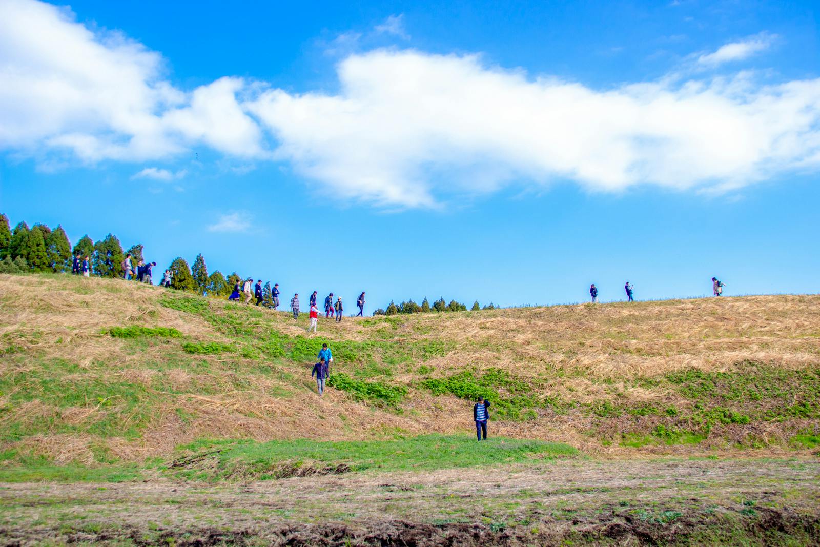 新田原古墳群は、見渡す限りの広大な田畑の中に、前方後円墳をはじめ、円墳や方墳が点在し、大小合わせてその総数は207基にも及びます。