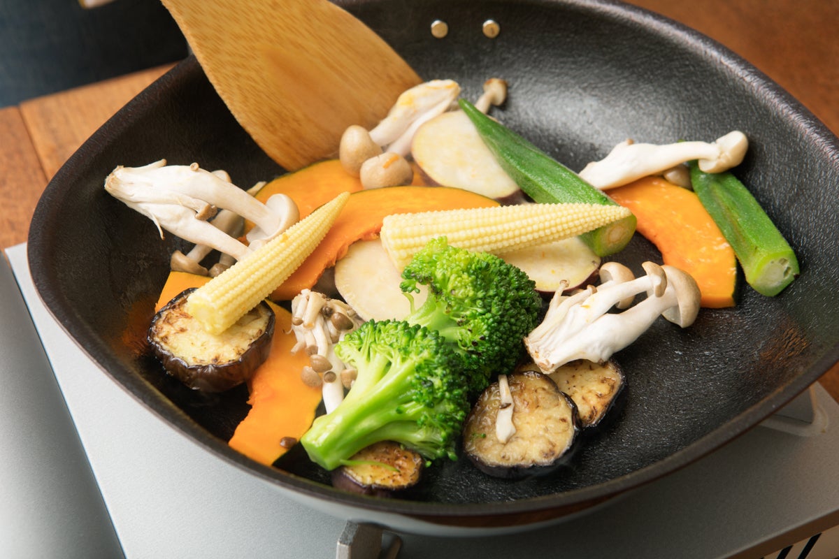 フライパンにオリーブオイル大さじ2杯を入れ、中火で野菜を炒めます。固めの野菜や根菜類は、あらかじめ火を通しておきましょう。仕上げに軽く塩胡椒するのがポイントです。