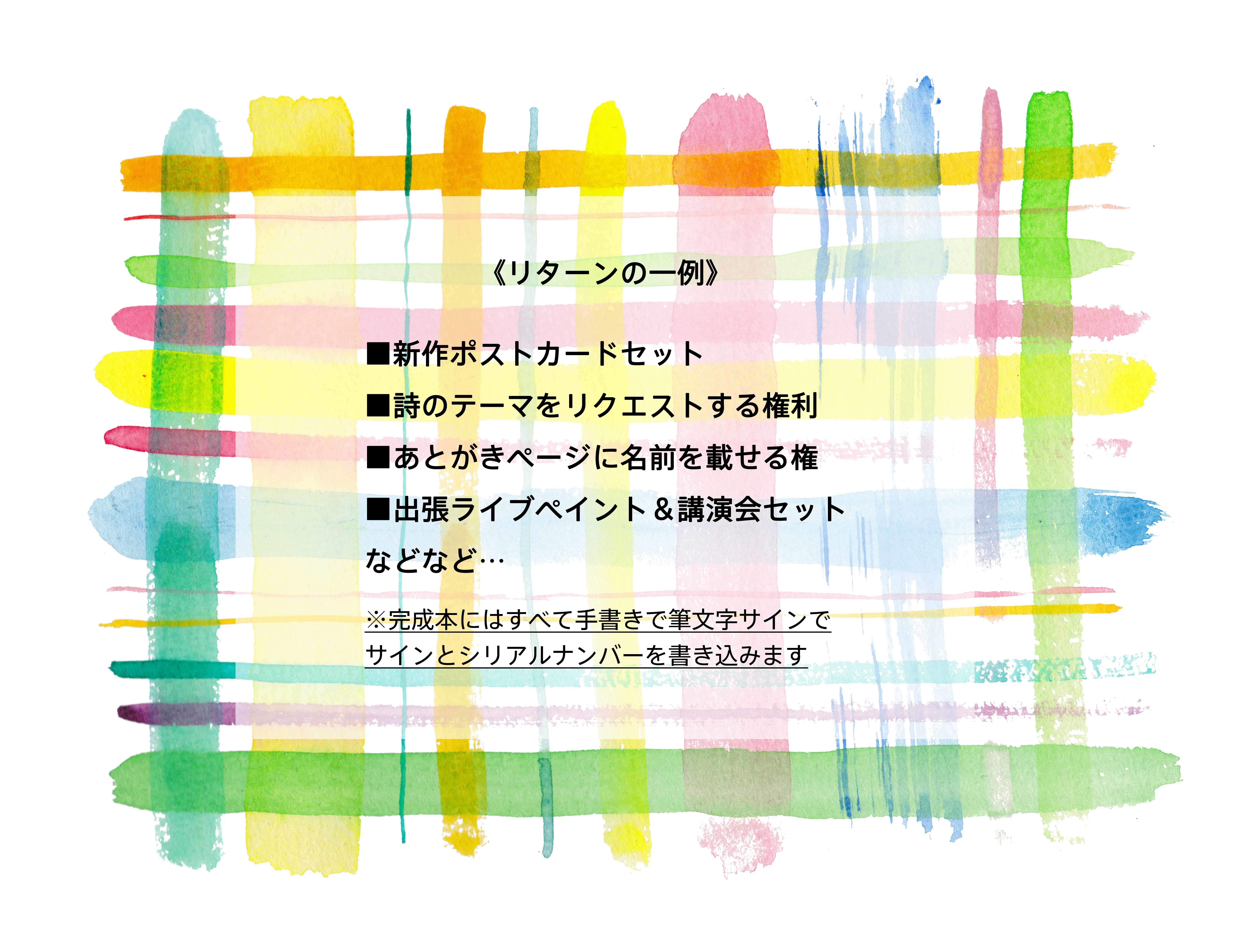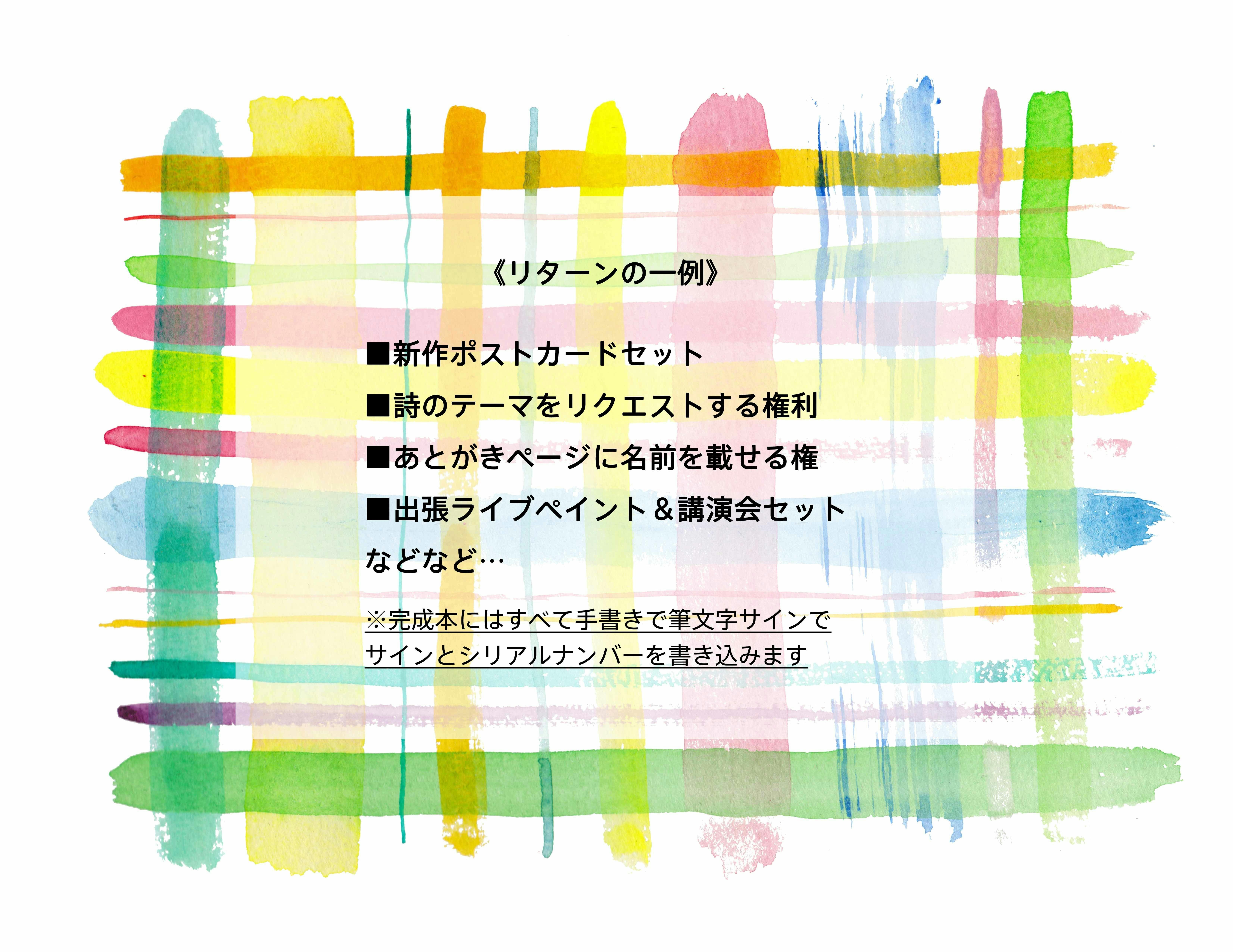 ご支援・ご予約くださった皆様には、裏表紙に直筆でサインと一言メッセージを書いた完成本&新作ポストカードと一緒に金額に合わせた素敵なお返しをご用意いたします。