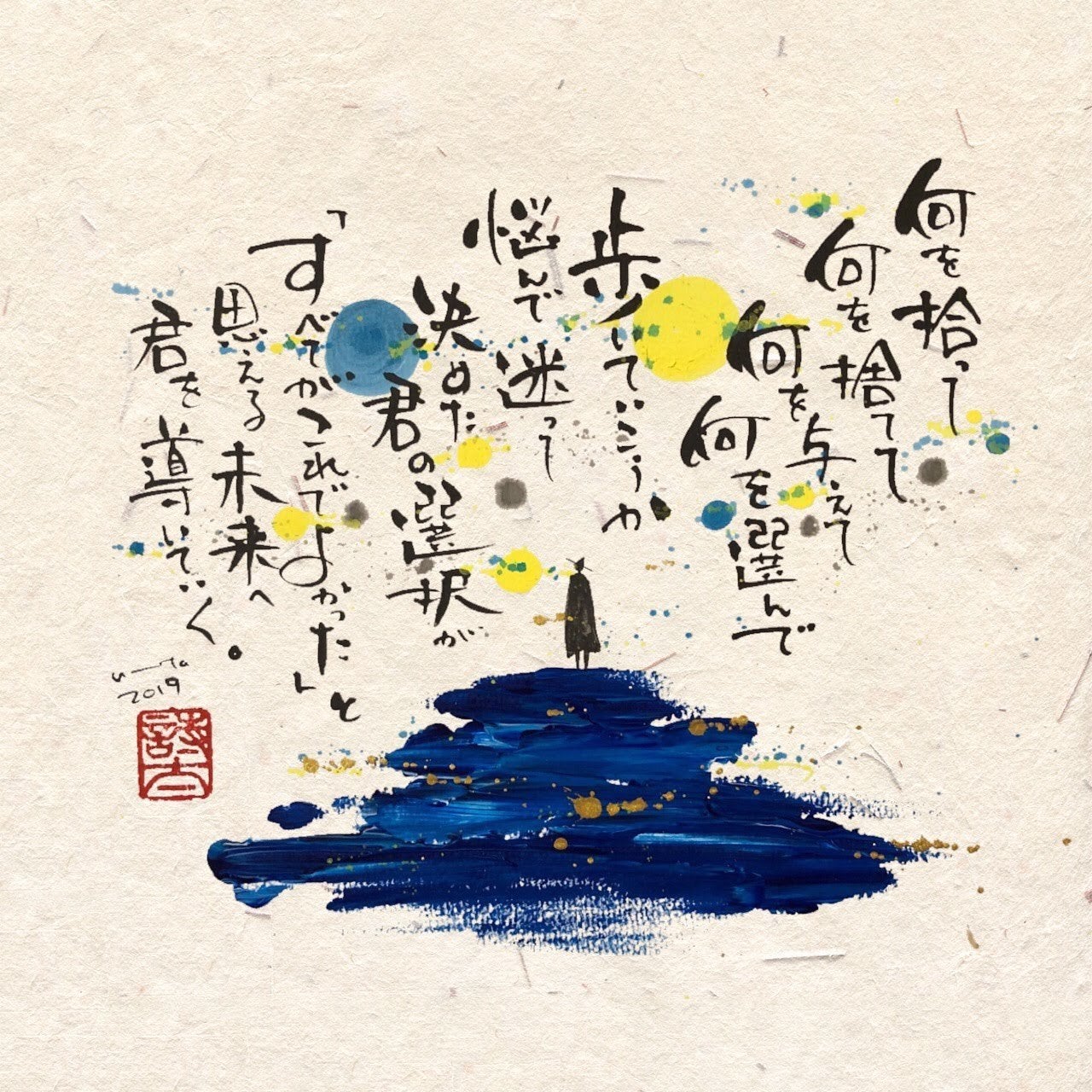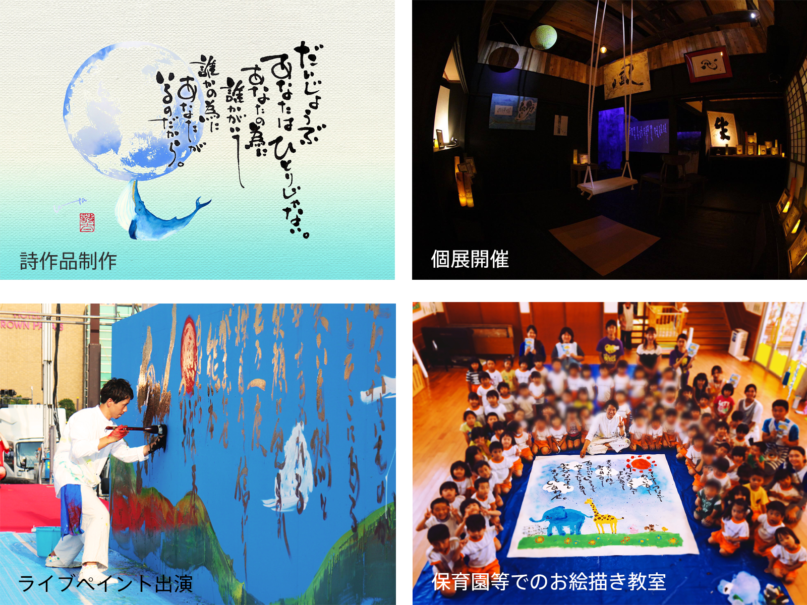 詩人・アーティストとして活動していますが、現在の活動内容は、詩や書作品の制作・ライブペイント出演・題字制作・個展開催・講演会・詩集出版…など様々です。
