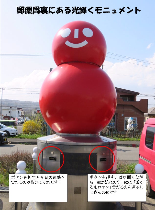 郵便局の裏にも雪だるまモニュメントを設置。当初は白い雪だるまのモニュメントですが、その後、なぜか赤に塗り替えし、リニューアルしちゃいました。