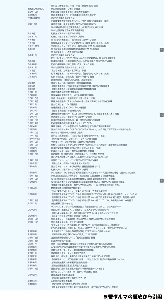 過去には、平成元年のNHK紅白歌合戦地方審査員として雪ダルマとともに出演したり、NHK放送、テレビ東京の他、海外では韓国文化放送での「日本レポート=雪だるまで町おこし」など、雪だるまで町おこしを一生懸命行ってきました。※詳細などは、下記のURLをご覧ください。