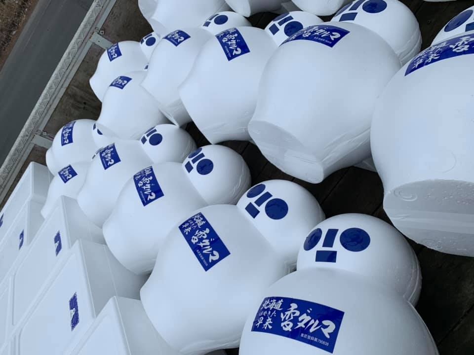 苫小牧港より船名「VEGA KAPPA」で、ブラジルに向けて出港いたしました。巨大雪ダルマ頭と体予備を含めて2セットと小さい雪ダルマ(発砲スチロール)50個を冷凍コンテナに入れています。写真は、冷凍コンテナへ積み込んでいるときの写真です。