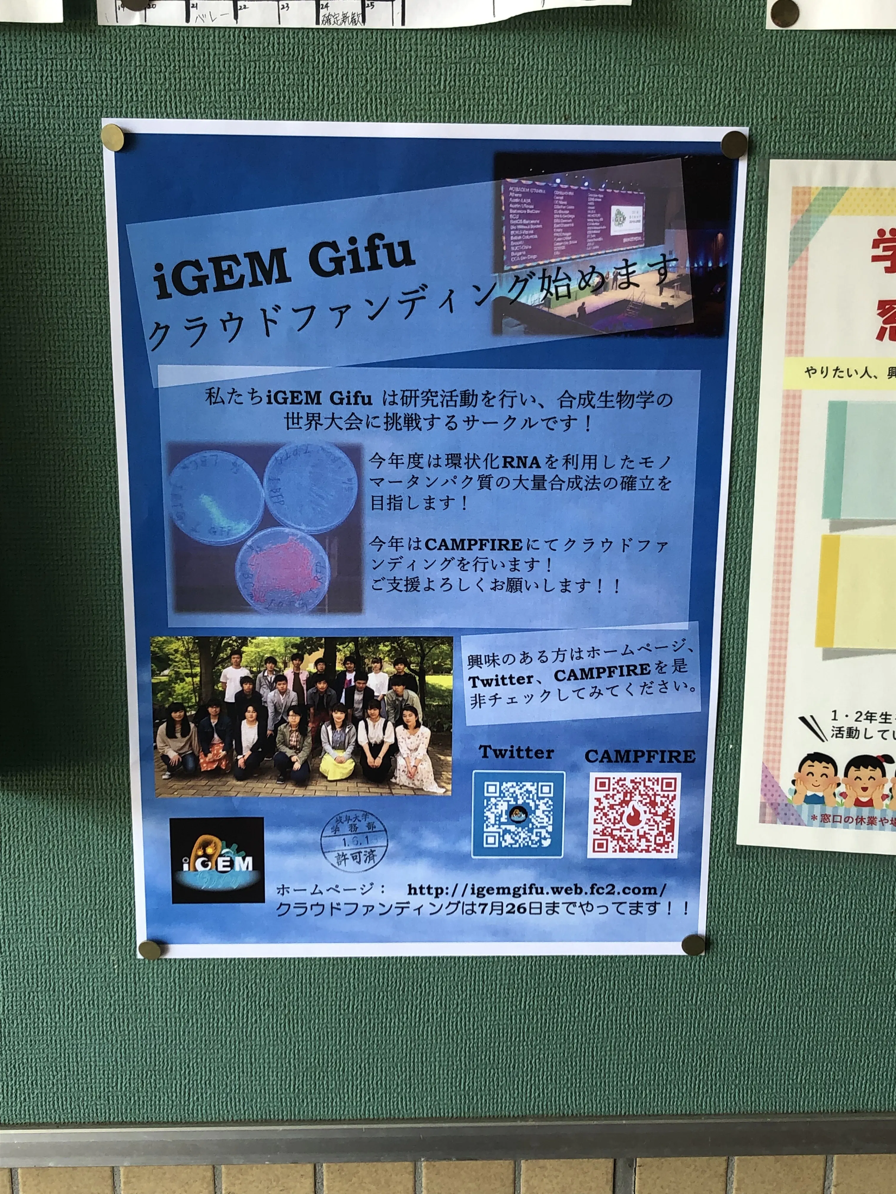 多くのお金と時間がかかるiGEMですが、我々はそれをやるだけの意味を見出しています。このクラウドファンディングを通じてiGEM Gifuがなにを目指しているのかを知っていただきたいのと同時に、我々の活動に興味を抱いてくれた方にご支援をいただき、ともにチャレンジしていきたいと考えております!