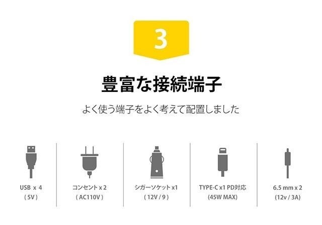 いろんな種類の端子をつけました!よく使うUSBポートは4つ、最新のType-C PD対応ポートを1つ、ACコンセントが2つ とよく使う端子が十分な数だけ搭載されています。