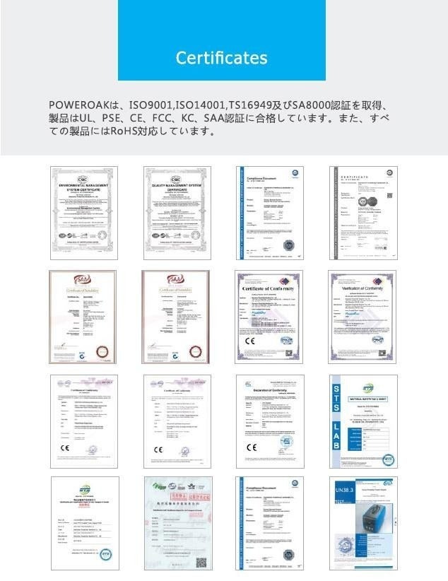 PowerOak社が製造するポータブル電源、貯蓄システム等は多くの機関から認証を受けており、確かな技術と安全が確保されております。また、日本の大手メーカーのモバイルバッテリーのOEM先として数多くの実績がありますので安心してお使いいただけます。