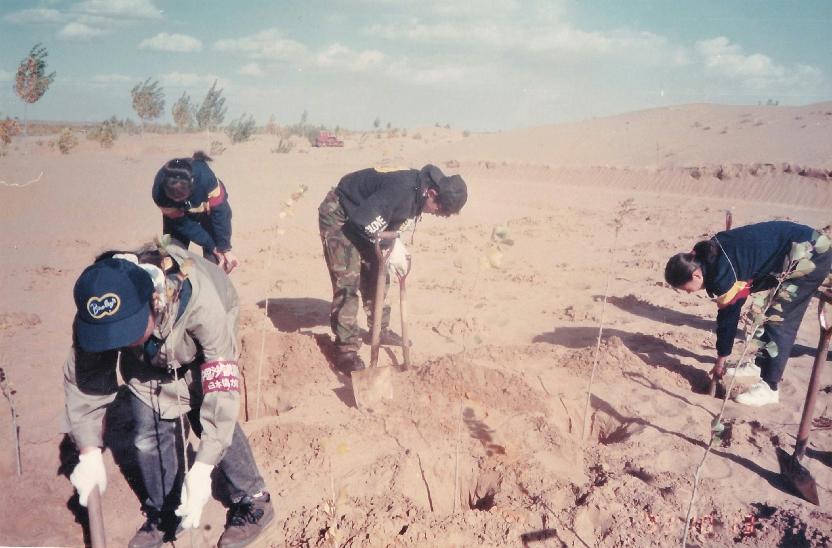 そういった中で私も実際、植林する機会を得ることができました。1992年と1993年、日本の砂漠緑化のボランティア団体がオルドスを訪れたので、私や私の生徒たちも一緒に砂漠に連れていってもらい、日本のボランティアの人たちと一緒に植林活動を行いました。