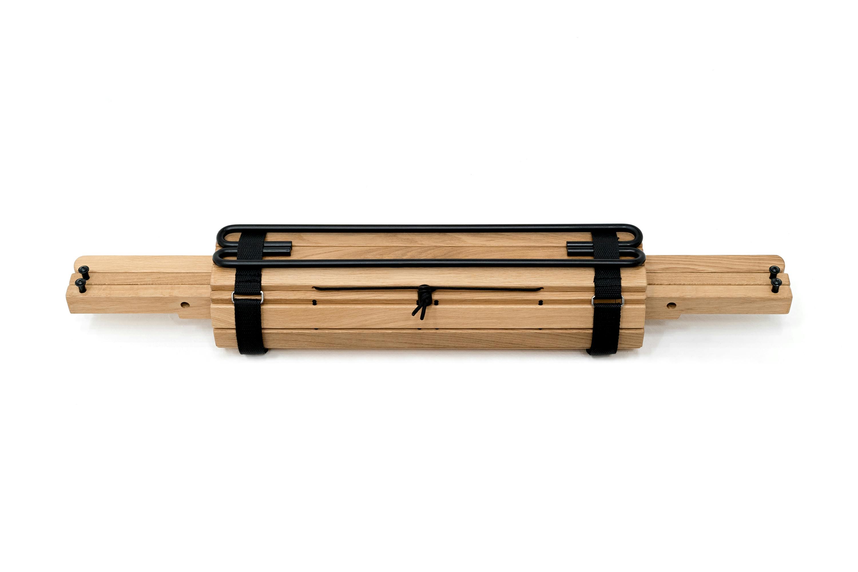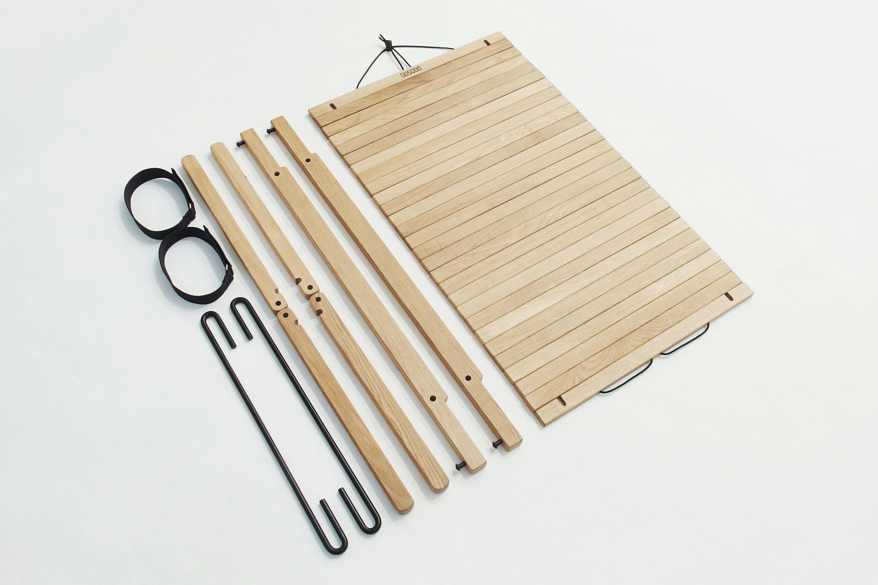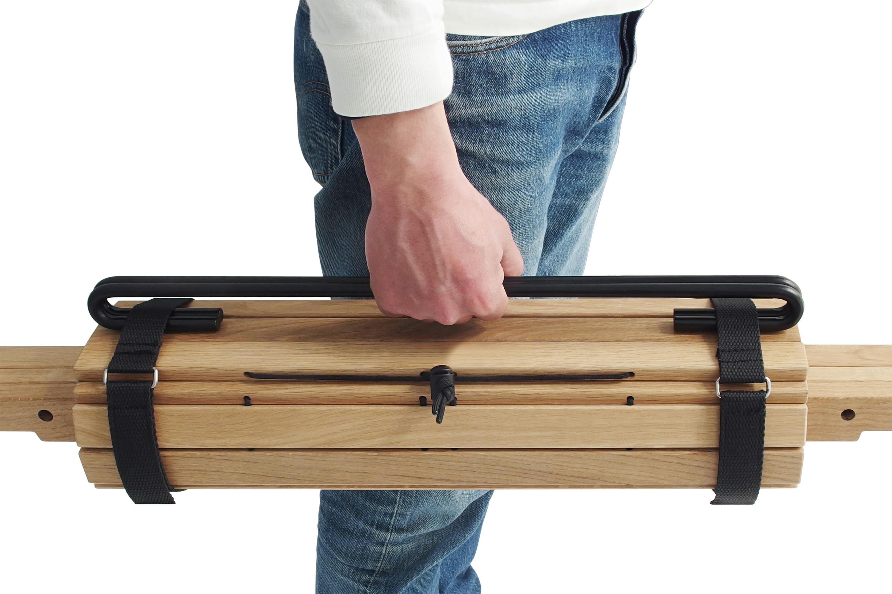 - 金物以外の部材を揃えて天板で巻き込み、二本の金物と合わせて付属のバンドで束ねます。たったこれだけで、テーブルに必要な全ての部材をストレスなく持ち運ぶことができます。