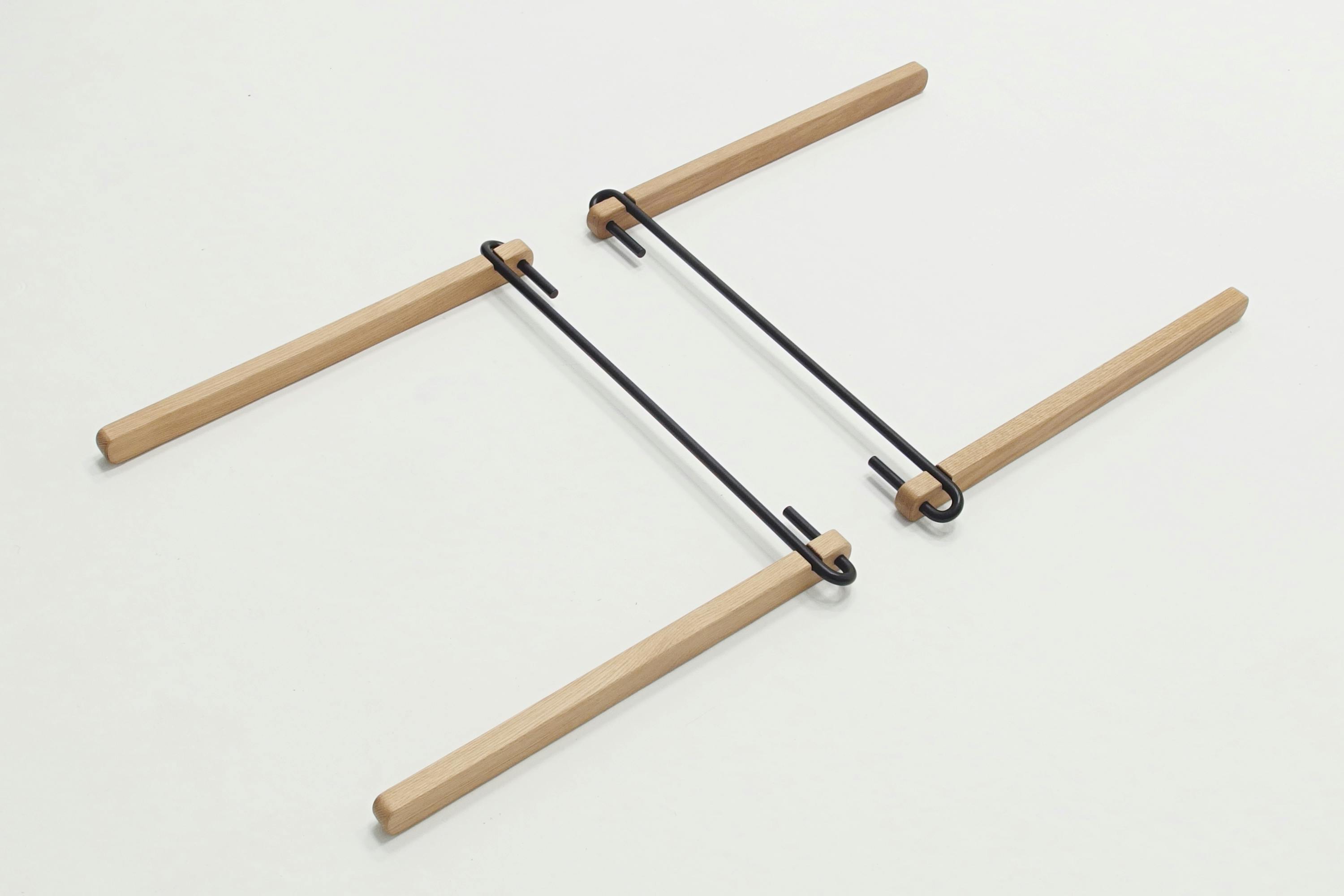- 両端をU型に曲げた金物に、木パーツを挿しこむ独自の脚構造と、ロール式天板によって、工具なしで簡単に組立分解することができるローテーブル。金物は脚を繋ぐだけではなく、カップや道具を吊るハンガーとしても機能し、収納運搬時はハンドルにもなります。