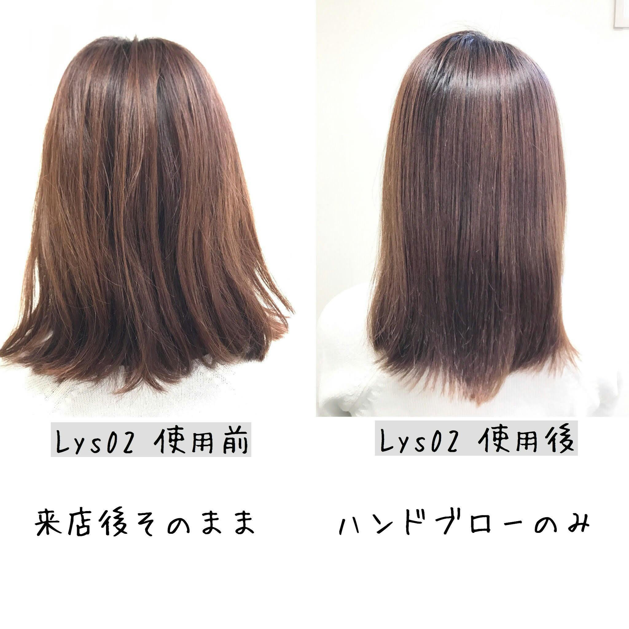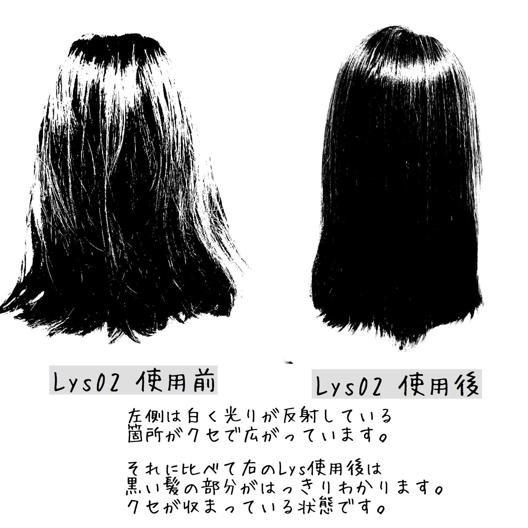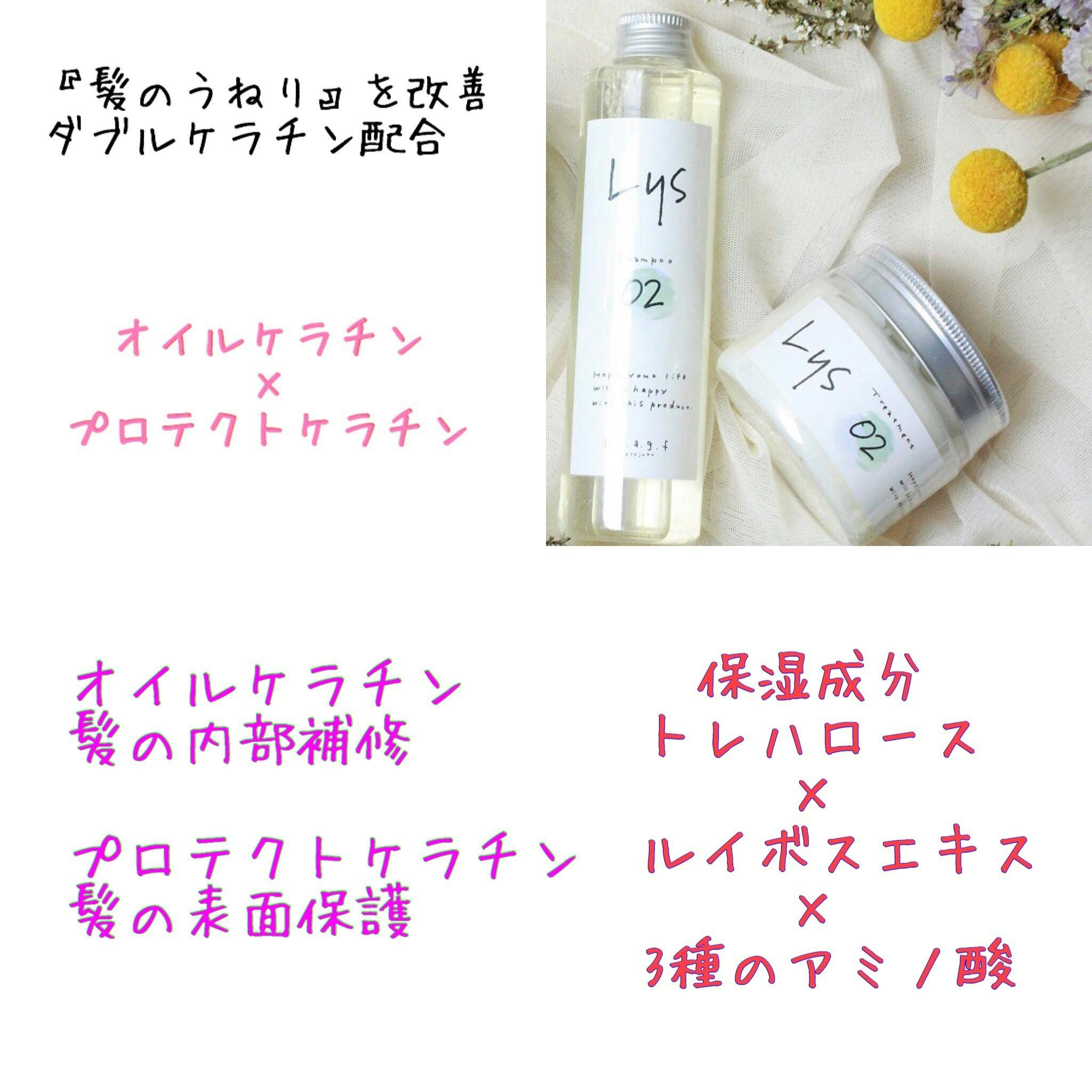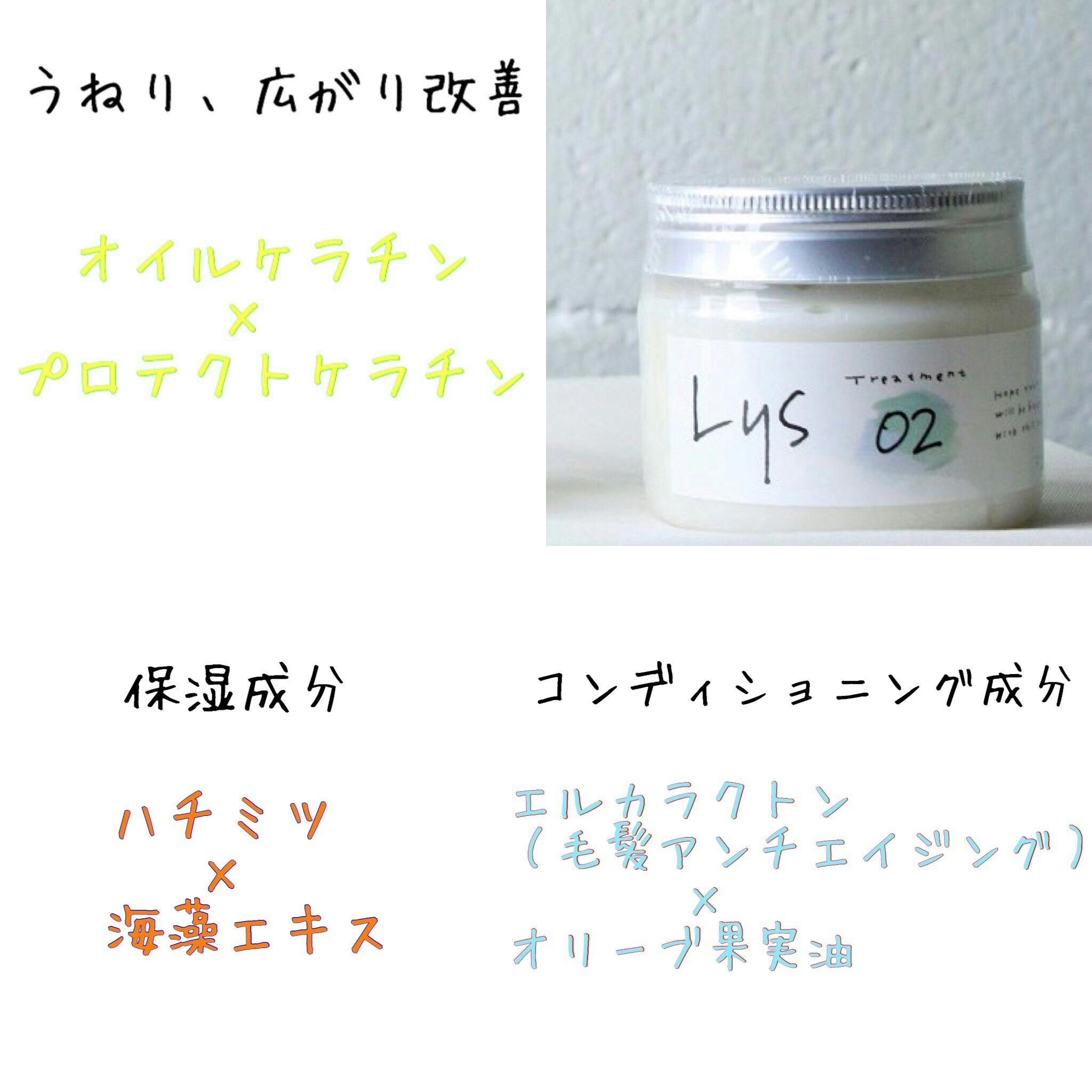 Lys02はケラチンを主成分とし、オイルケラチンという髪の内部を補修する成分でハリコシをで髪の芯つくり、髪の外部を保護するプロテクトケラチンと言う成分で水分とツヤを補い髪を優しく守ります。