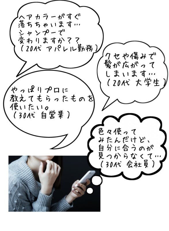 1,『ヘアカラー色持ちの悩みや、髪の傷みやクセでの広がり』を解決したい。