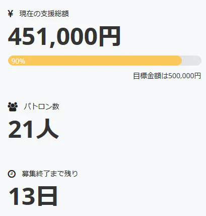 これにより調達率は90%にまで上昇、パトロン様は二十一名となりました。