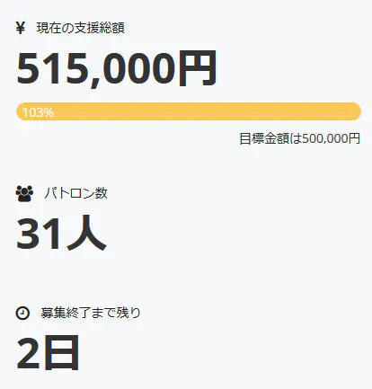 これにより調達率は103%まで上昇、パトロン様は三十一名となりました。