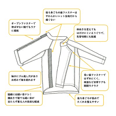そこで、着せる人の負担を軽減するために、上体を起こしたり、重い腰や足を持ち上げなくても着せられる服を作りました。