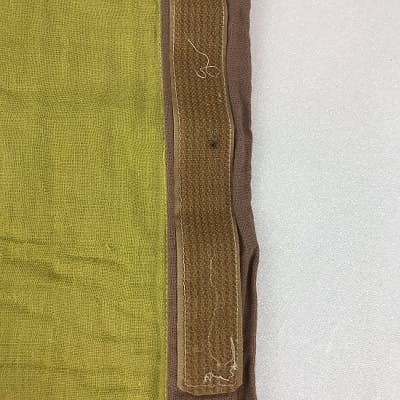肩と脇の切り離し部分には、面ファスナーを使っています。一般的には、写真のように糸くずが付いたり、着脱を繰り返すうちに、もじゃもじゃしたB面の方が、だんだん接着力が弱くなってきます。ですので、この製品には、B面は使わずに柔らかいニット生地を使っています。また、A面の方も、縫製後一番最後に縫い付けていますので、取り換える事が可能です。ちなみに、ガーゼの生地はデリケートで縮みやすく、写真のように面ファスナーがうねってしまうのですが、この製品は縫製後洗い加工をして、最後の最後に面ファスナーを縫い付けますので、きれいに仕上がっています。
