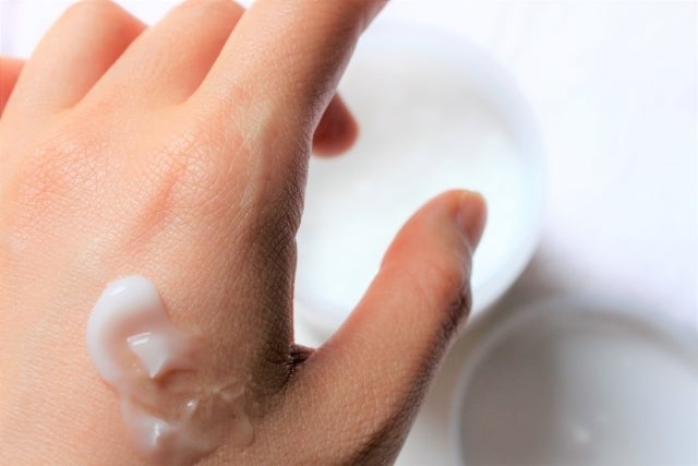 手の甲に真珠一粒分を目安にとり、お顔や手に全体にやさしくなじませます。朝晩のお手入れの最後にお使いください。