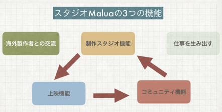 スタジオMaluaは、映画制作を中心に、映画関係者、地域の方々、そして映画を観に来てくださるお客様、三者が交流できるようなシステムの構築を目指している、映画制作コミュニティです。