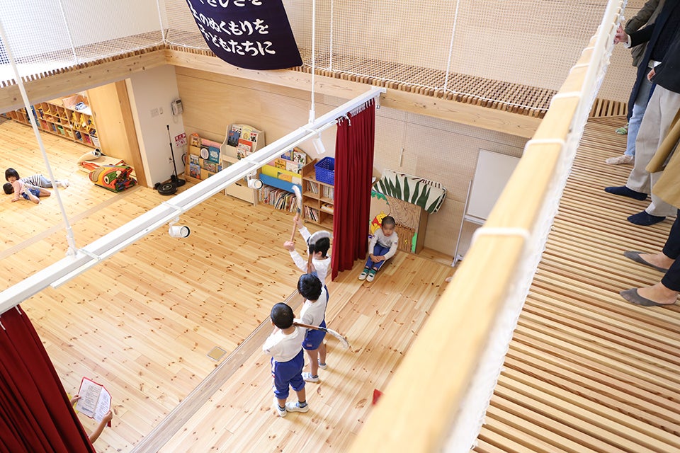 園内には、こどもたちの想像力をふくらませるいろいろな仕掛けが詰まっていて、のびのびと遊ぶ園児たちの姿が印象的でした。