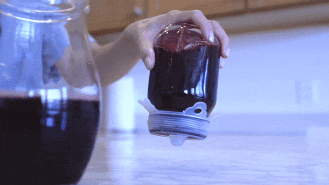 「UniLid」で密封した瓶は逆さにしても液漏れしません。