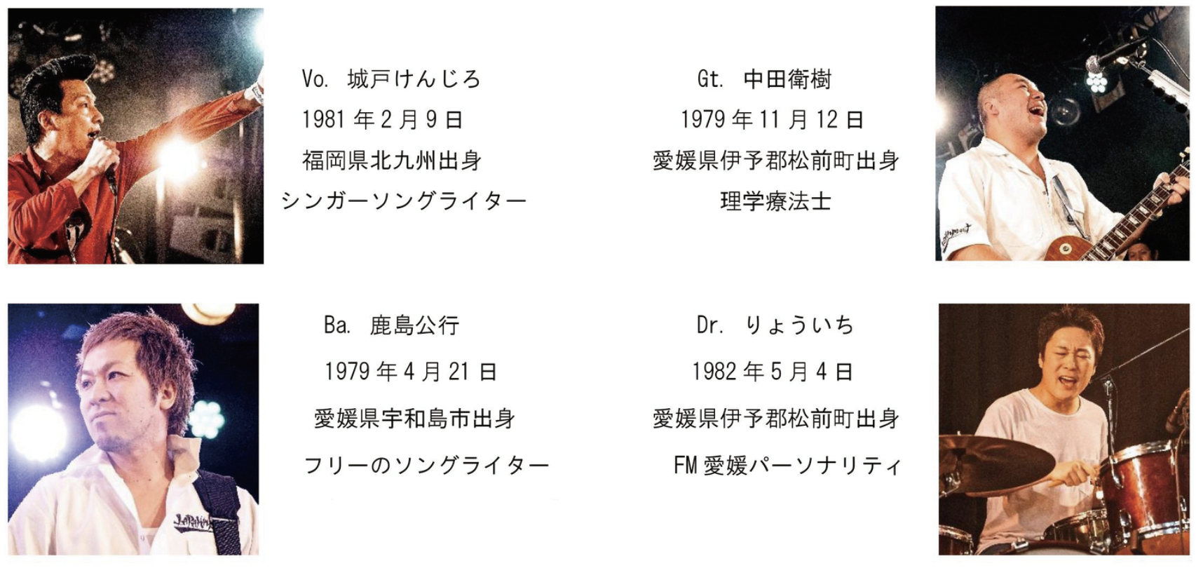 1999 年 愛媛県松山市松山大学のバンドサークルで結成。インディーズ時代 から四国地方で人気を博し「四国地方最強のロックバンド」とも呼ばれた。 2004 年「哀愁交差点」でトイズファクトリーからメジャーデビュー。 メジャーデビューアルバムはオリコン 10 位を記録するも、2007 年解散。 その後 2015 年 10 月、8年ぶりに再結成をし、現在も本業の傍ら愛媛県松山市 で活動を続けている。