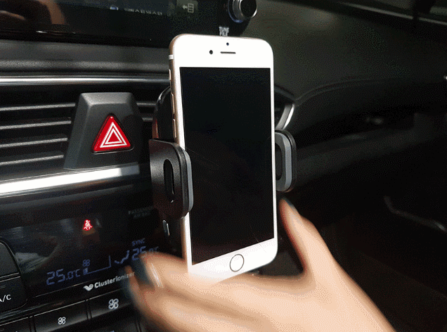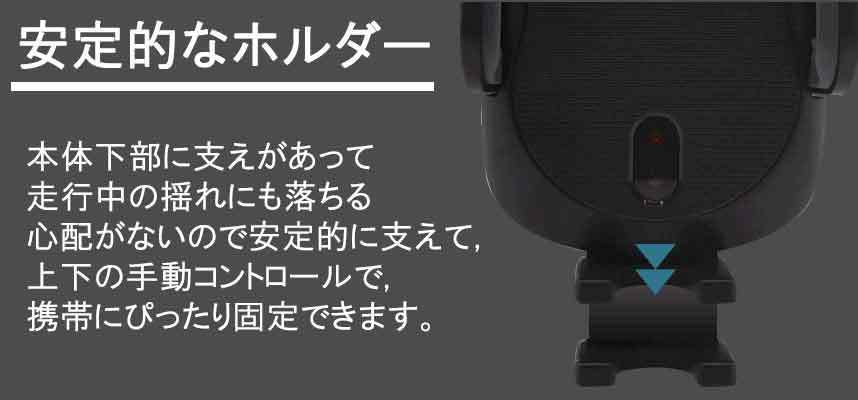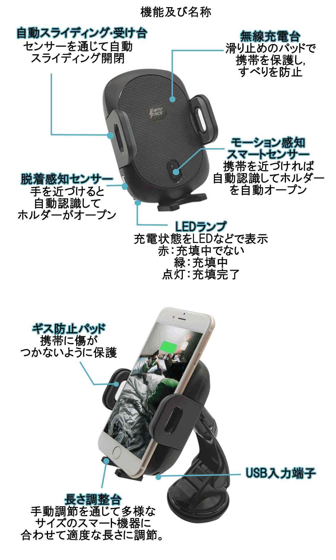 ■【ワンタッチロック】これから充電は片手で楽にスマホをホールドします。ホルダーの真ん中に赤外線センサーを近寄せると、バネ式アームが素早く開く仕組みになっていて、スマホを置くと自動にロックされます。取り外しは左側の下部のセンターにタッチするだけホルダーが開きます。