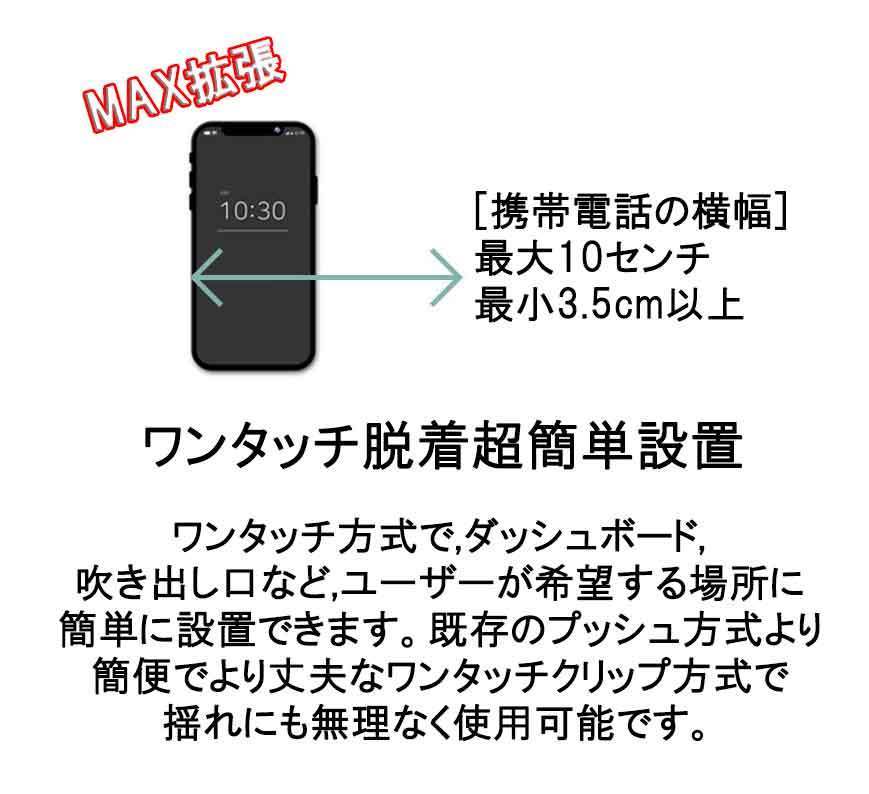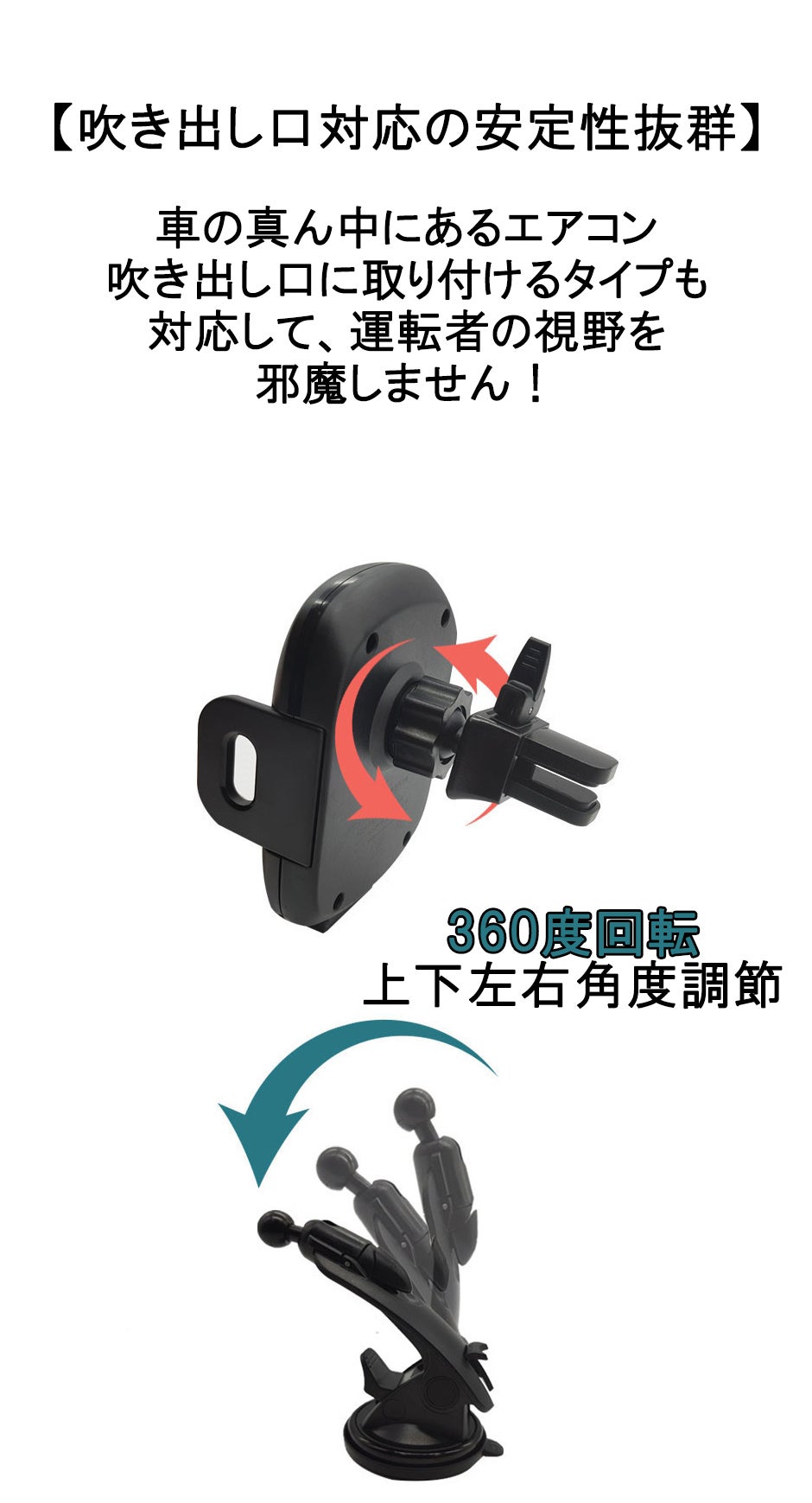 ■【360度回転、吹き出し口&吸盤ホルダー】360度回転するボールジョイントを採用しており、角度を自由に調整して気楽に見やすい位置にセットできます。もっと安全に運転できるような設計です。【吹き出し口クリップ式&吸盤式】付属のアダプターは吹き出し口式と吸盤式の2種類です。吹き出し口式:カーエアコンのルーバー部分にアダプターを奥まで差し込んで固定します。吸盤式:好きな位置に貼り付けて固定できます。
