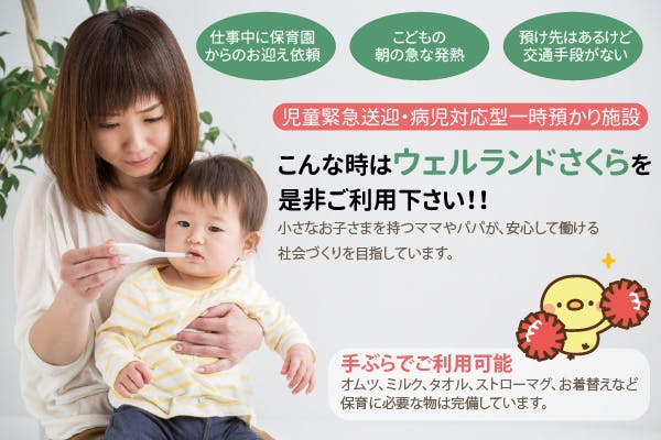「ウェルランド」が提供するサービスはお母さん達以外にも保育園、お母さん方の職場、小児科クリニックにも頼りにされています。保育園は子供達が病気になった場合、お母さんがお迎えに来るまでは保育士を一人その子供に配置するため、元気な子供達を保育するスタッフが手薄になってしまいます。職場の場合は急な早退、欠勤によるマンパワー不足の防止。小児科クリニックの場合は、症状がひどくなる前に早期受診できることや新患の確保にも繋がります。