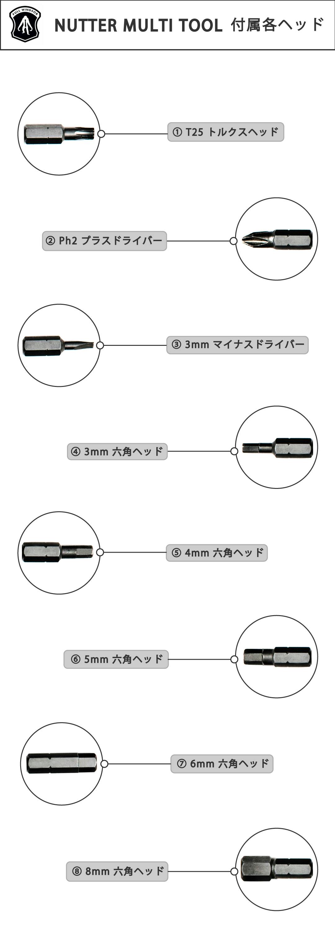 各ヘッド( T25トルクスヘッド/ Ph2プラスドライバー/ 3mmマイナスドライバー/ 3,4,5,6,8mm 六角ヘッド)
