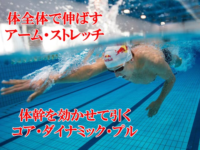 ストローク中、頭上に向けた腕と体幹のストレッチ、ほぼ同時に逆側で起こるコアを効かせたダイナミック・プルを解説しています