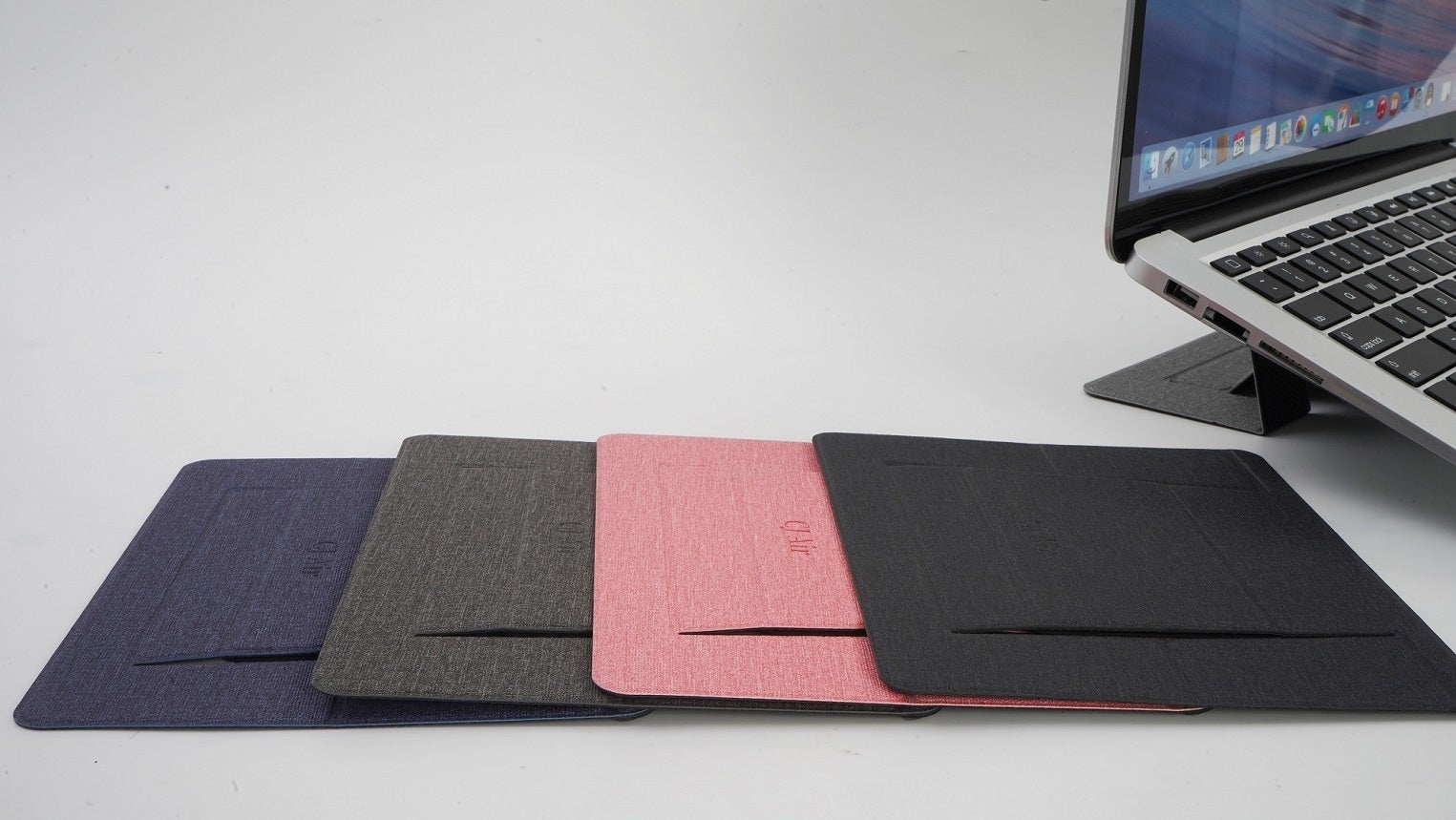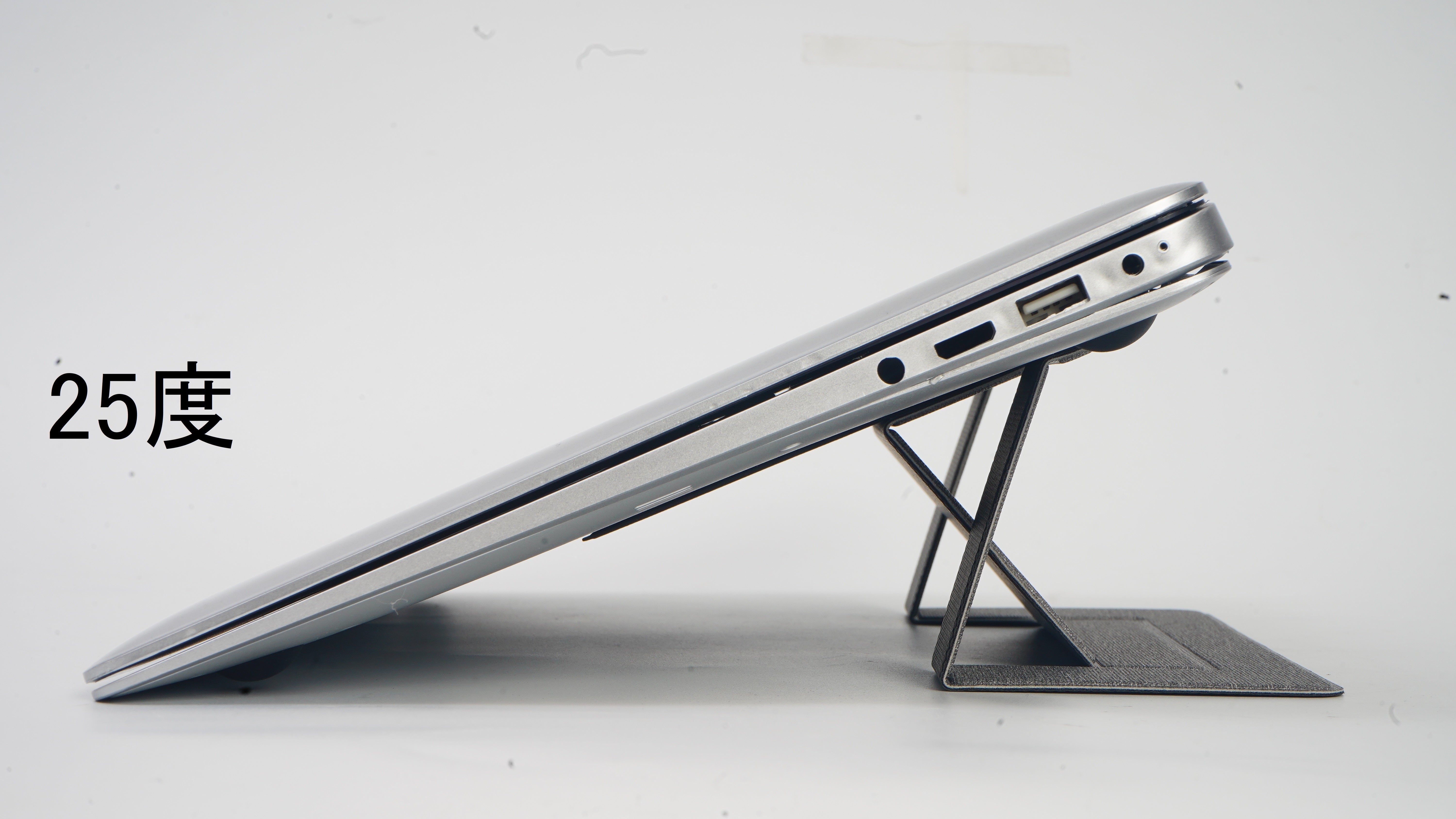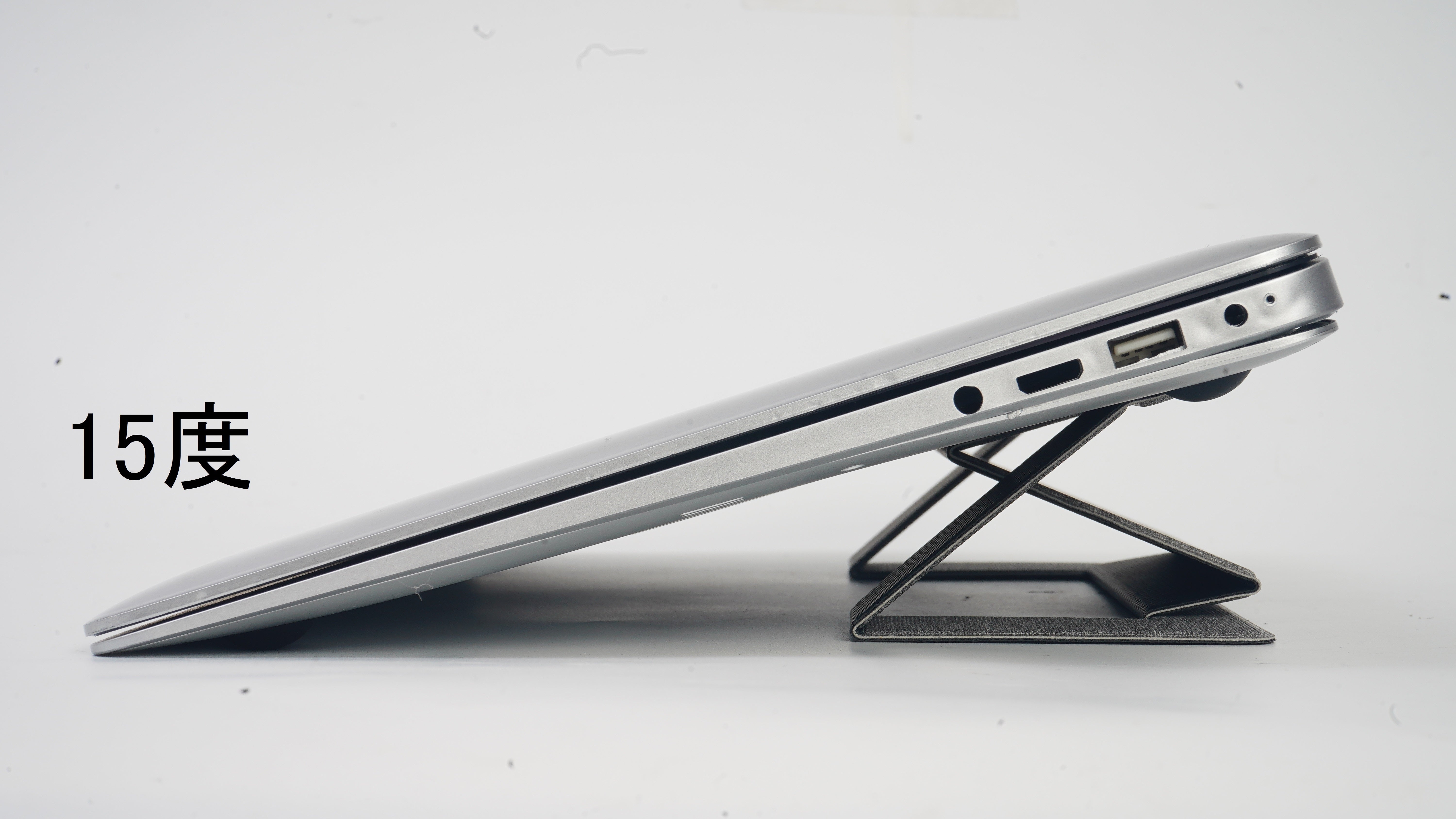 ノートパソコンにつけても邪魔にならない。もっと薄くもっと小さくもっと強く。数え切れない修正案しを出し、今の商品が出来上がりました。ノートパソコンと一体になっているようになりますので外出使用時にスタンドを忘れることもうありません。