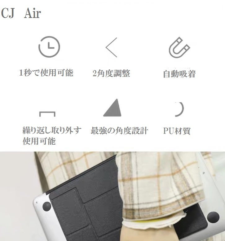 今までのPCスタンドの不十分な所を改新して、時間、場所にも関係なく楽しくノートパソコン及びタブレットを使用するように今度の「PCと一体化!世界最薄級のノートPC&タブレット対応スタンド CJ Air」を作りました。薄さと軽さを追求しながら製品の強度も視野に入れ最大限に補強致しました。