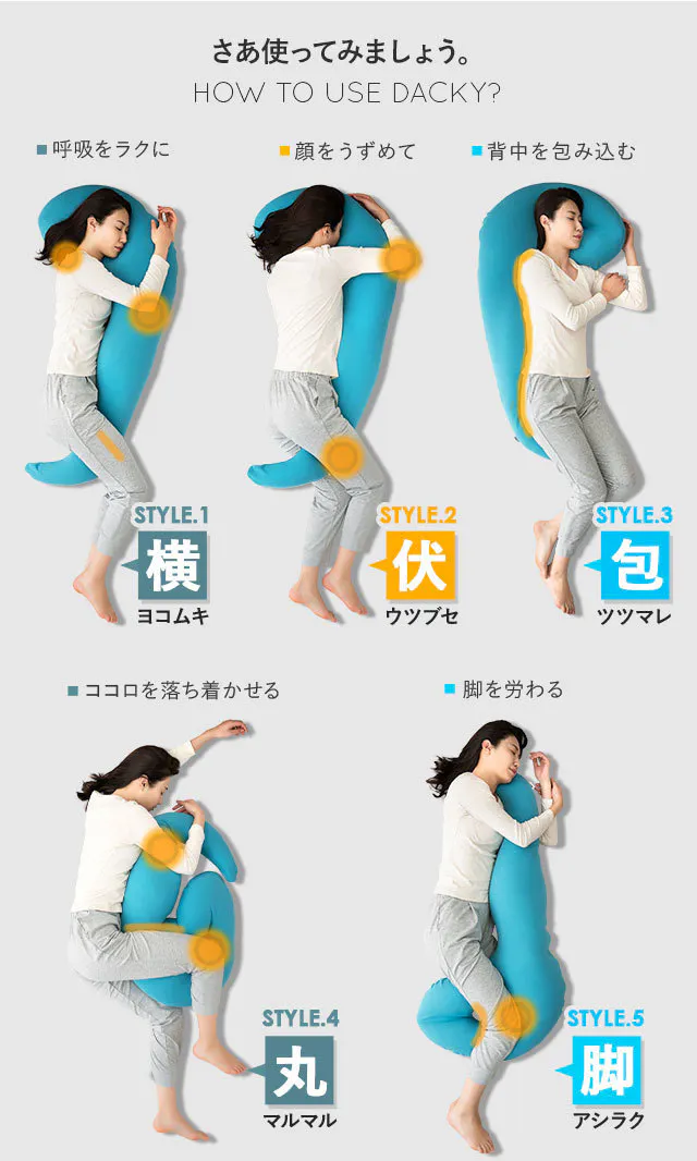様々な眠り方に対応した抱き枕「Dacky」は、あなたの寝姿勢をしっかりサポートします。