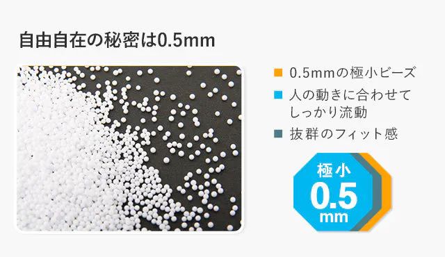 中に含まれている国産発泡ビーズは、様々な寝姿勢に合わせて流動します。ワタのように柔らかすぎず、ウレタンのように硬すぎない、絶妙なフィット感をぜひ体感ください。