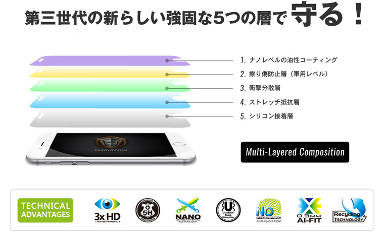 このX-ONEはあなたのスマートフォンの液晶画面を様々な衝撃から守れるよう長年にかけて研究、開発してきました。5年間の試行錯誤を経て、ついに3代目のX-ONE保護フィルムを完成させました。