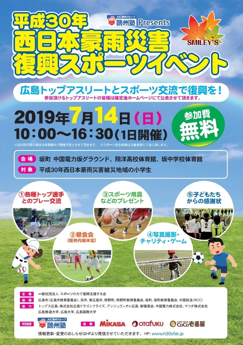 西日本豪雨災害地域有志で、今年3月に一般社団法人「スポーツの力で復興支援する会」設立し、令和元年7月14日(被災1年)時期にスポーツイベント開催を準備しています。