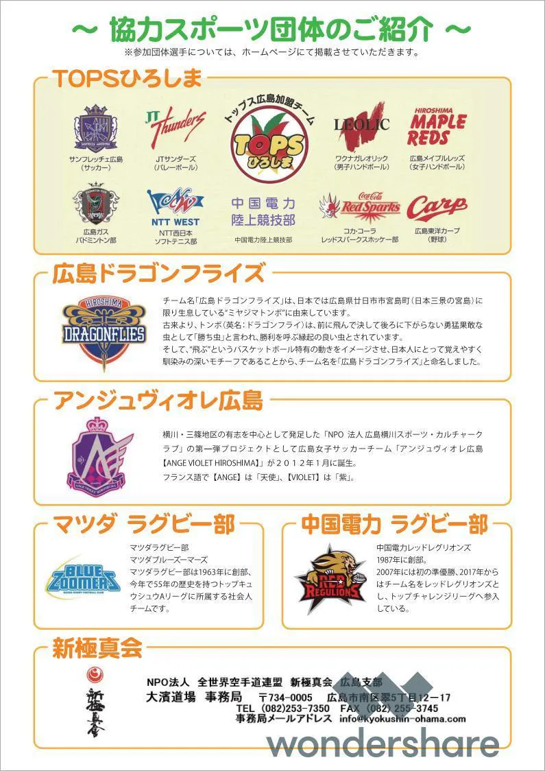 JTサンダース、広島ドラゴンフライズ、アンジュビオレ広島、新極真会道場、中国電力&マツダラグビー部、社会人野球チームの予定です。