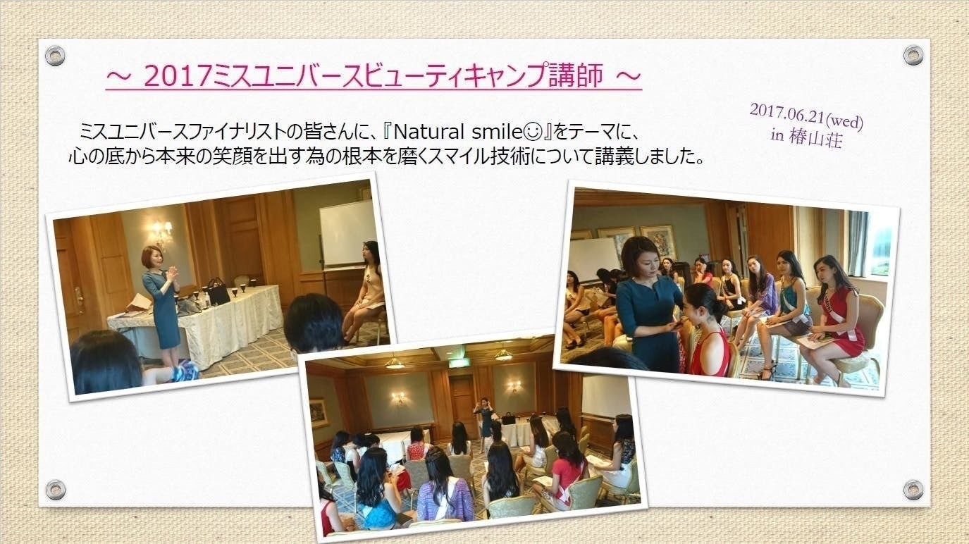 始めまして。2017ミスユニバースビューティキャンプ講師、2018ミスユニバース評議員の井上順子です。普段はビューティセラピストスクールや、口輪筋マッサージのインストラクターとしても活動しています。また、株式会社Gramaryの代表としても、皆さまの美と健康のお手伝いをしています。