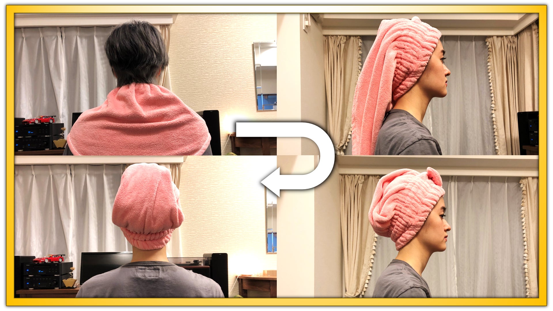 濡れた髪を簡単にまとめられて、ゆっくり保湿しながら吸水して、30分から1時間ほど経ってからサッとドライヤーをかければ、潤いのある艶々髪のできあかり!