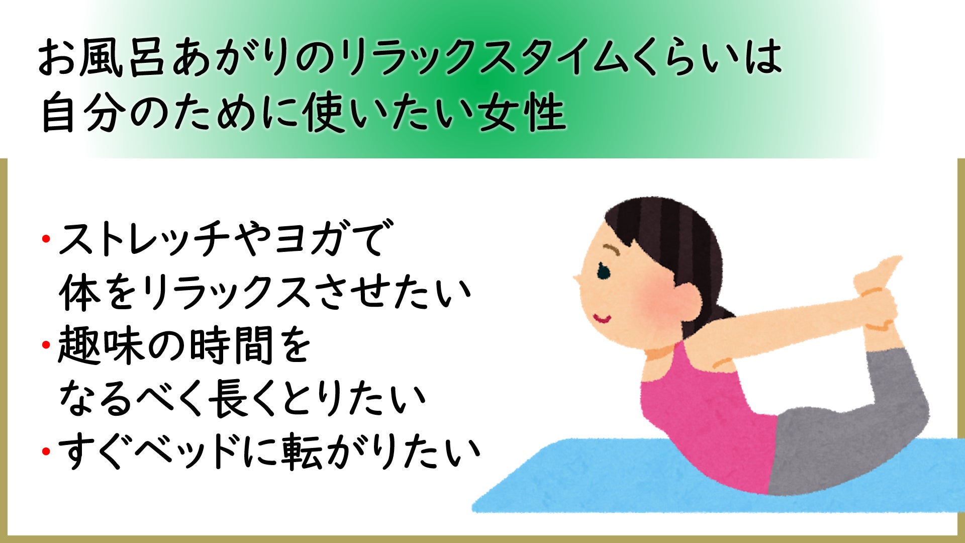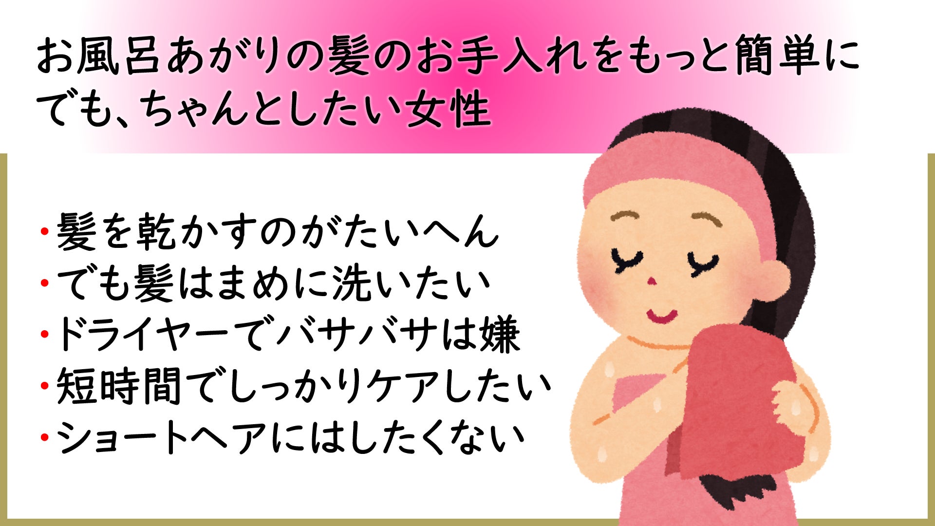 今までに5万人以上の女性の美と健康のお手伝いしている中で、女性は1日の中で最大の癒しの時間であるはずのお風呂から上がると、もう一度、悪戦苦闘しなければいけないことに気が付きました。