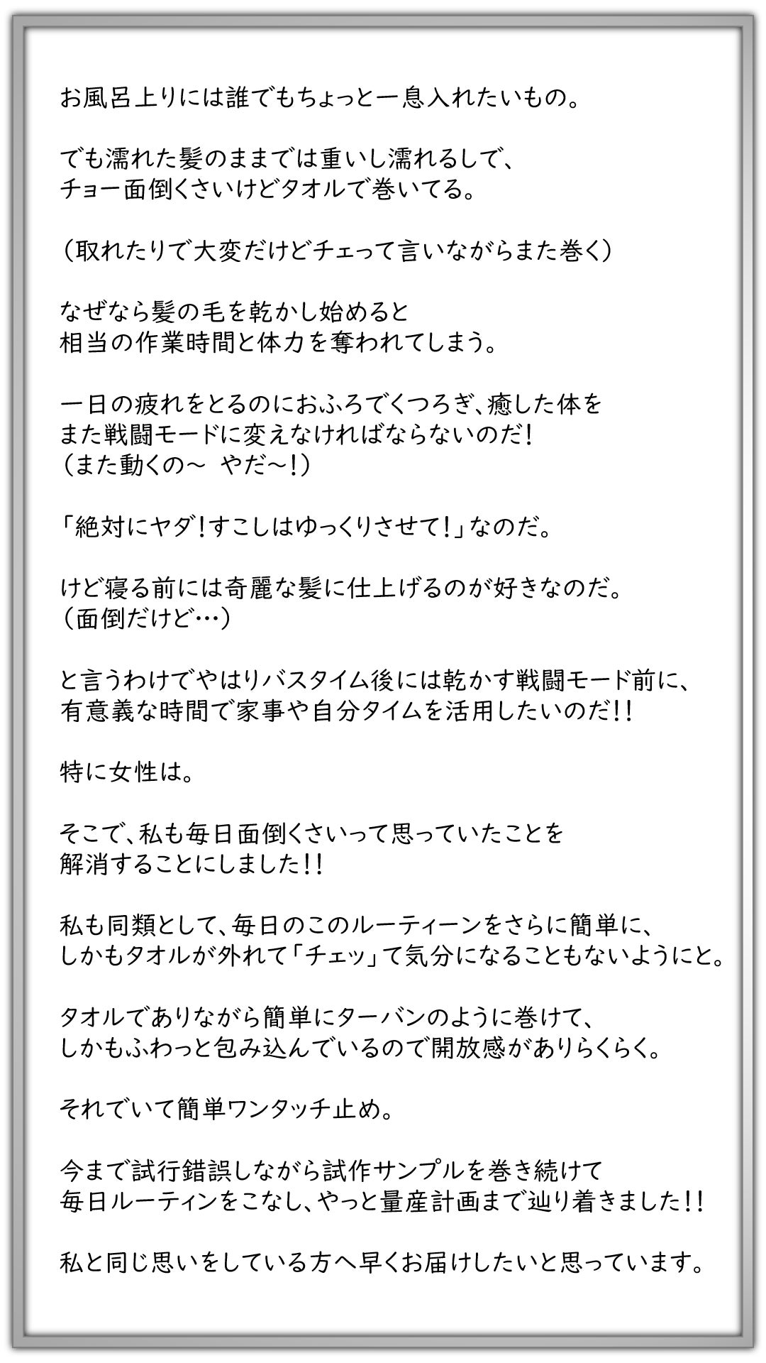 これを量産して、私と同じように、お風呂あがりの濡れた髪の毛をわずらわしく思っているたくさんの女性に、めんどうから解放されて欲しいと思っています。