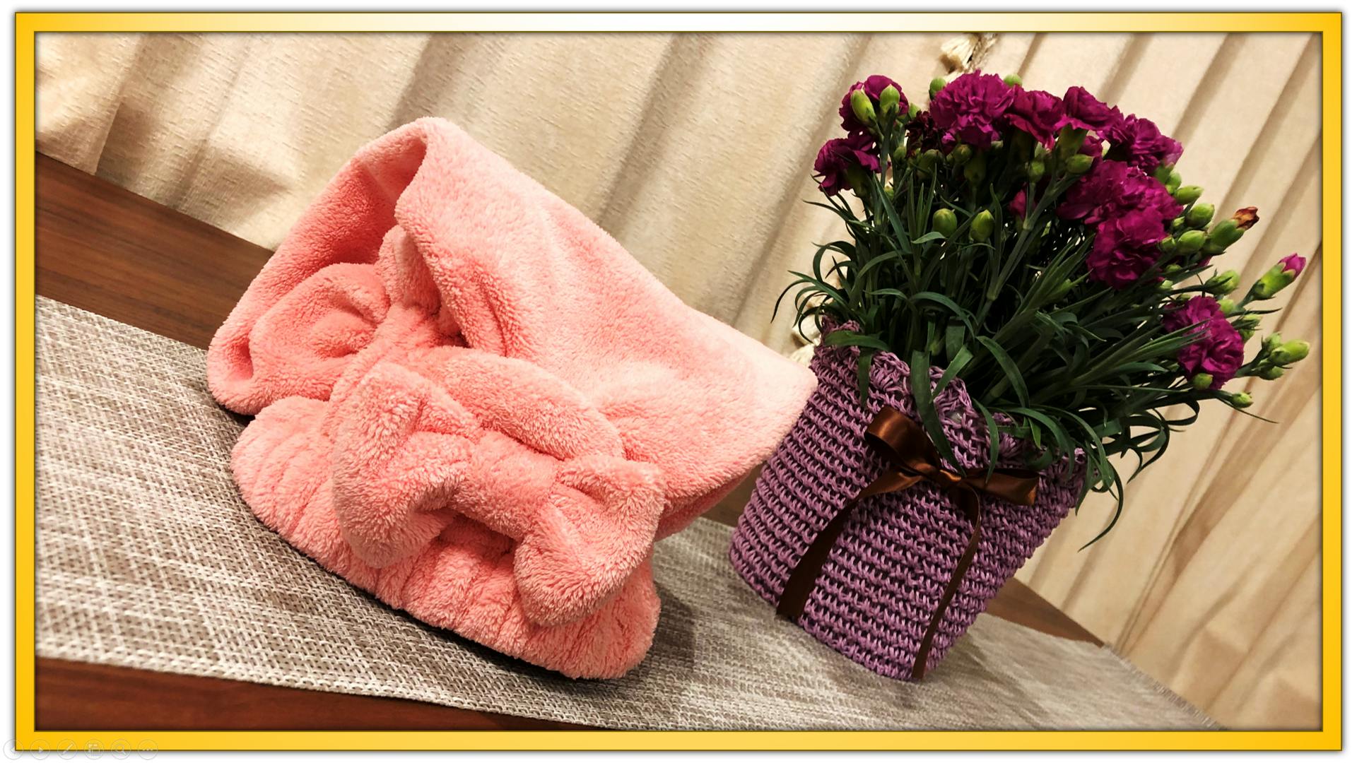 ③髪をくるんだタオルをおでこの方に巻き上げて、リボンで固定します。