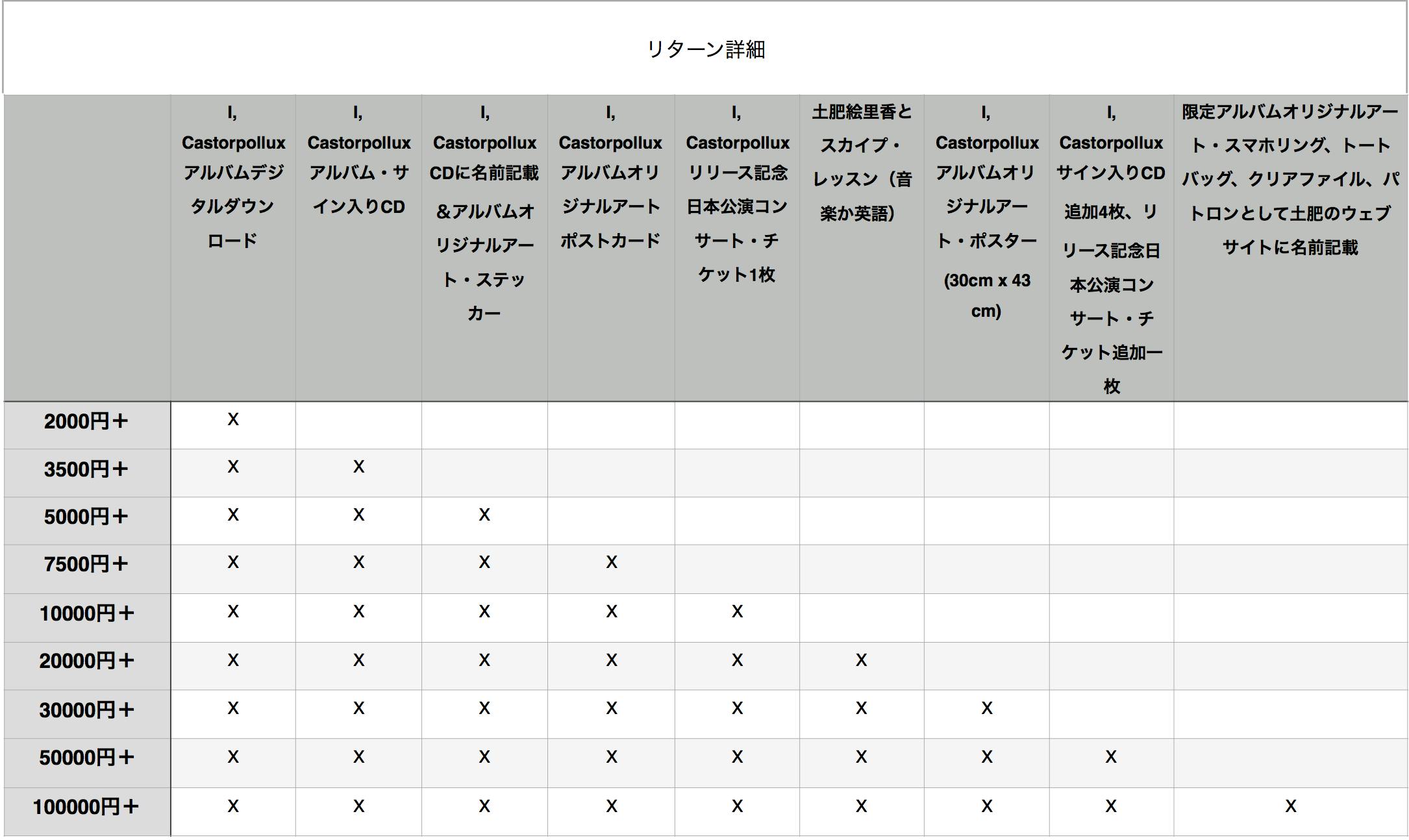 20000円+ アルバムデジタルダウンロード、アルバム・サイン入りCD、アルバムCDに貴方の名前を記載&アルバムオリジナルアート・ステッカー&ポストカード、プレリリース記念日本公演コンサートチケット1枚(大阪、2019年冬の予定、日程・会場が決まり次第Eメール・こちらでお知らせ)+加えて土肥とスカイプ・レッスン(音楽レッスンか英語のレッスン)