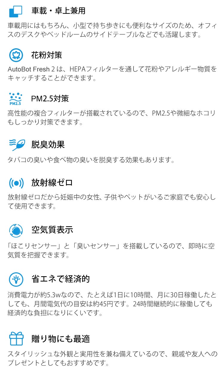 AutoBot Fresh 2 は清浄機能に加湿機能を追加し、空気浄化をしながら加湿も行ってくれるコンパクトな加湿空気清浄機です。