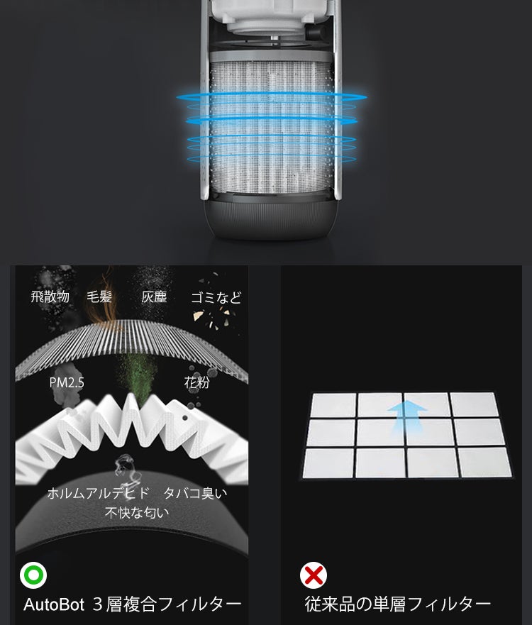 「AutoBot Fresh 2 」のフィルターは中がくり抜かれた円柱形状に設計され、ナノシルバー層、HEPAフィルター、活性炭フィルターの3in1構造です。