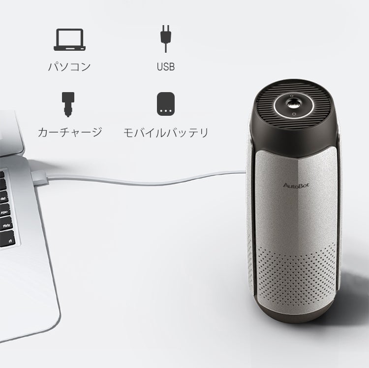電源はUSB対応で、学校や職場などコンセントが無い場所でも、身の回りの空気をキレイにすることができます。自宅や職場のデスクなどに置き、パソコンやモバイルバッテリーなどに接続して利用することもできます。