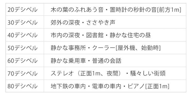 ※音の大きさを表す単位としてデシベル(dB)が使われています。身近な音の大きささ上記のような感じになります。