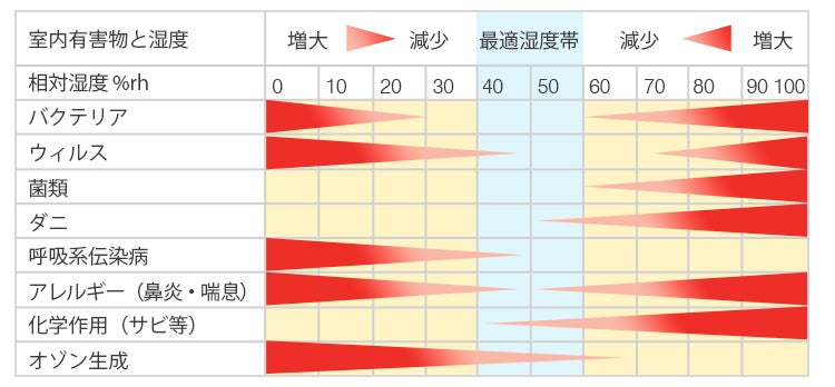空気が乾燥すると、喉の粘膜の防御機能が低下し、インフルエンザにかかりやすくなります。相対湿度を50%以上に保つことでインフルエンザウイルスの生存率が急激に低下すると考えられ、40%~60%の間に湿度を調節することが最適湿度とも言われています。加湿はインフルエンザ対策に大変有効です。
