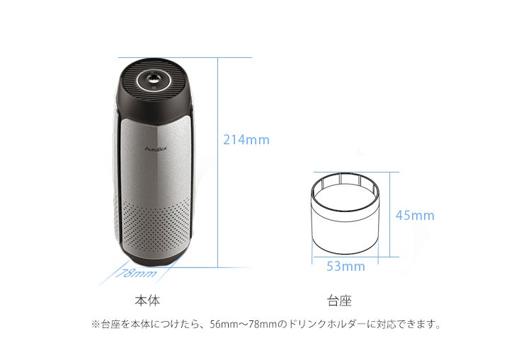 設置には直径56mm以上のスペースが必要です。ドリンクホルダーの直径は78mm以上の場合、直接にAutoBot Fresh 2を収まることができますが、ドリンクホルダーの直径は56~78mmの場合、AutoBot Fresh 2と付属した台座を装着した後、ドリンクホルダーに収まることができます。事前にドリンクホルダーのサイズと位置の確認をお願い致します。